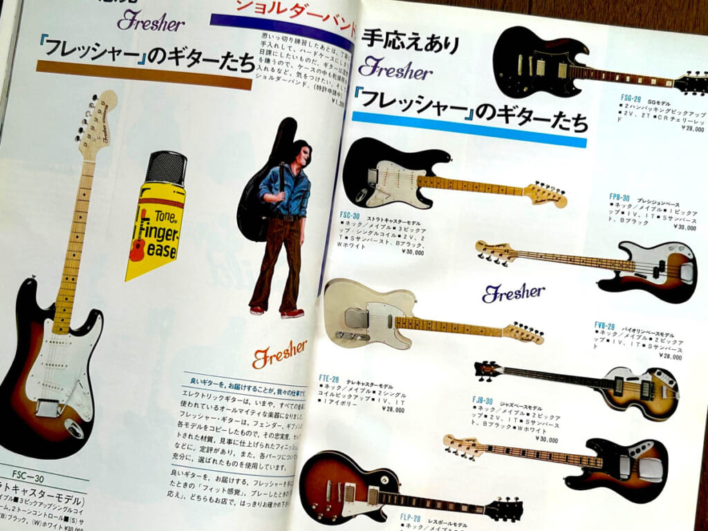 フレッシャーはフェンダー・スタイルのモデルを数多くラインナップしていた。『楽器の本 1976』より。