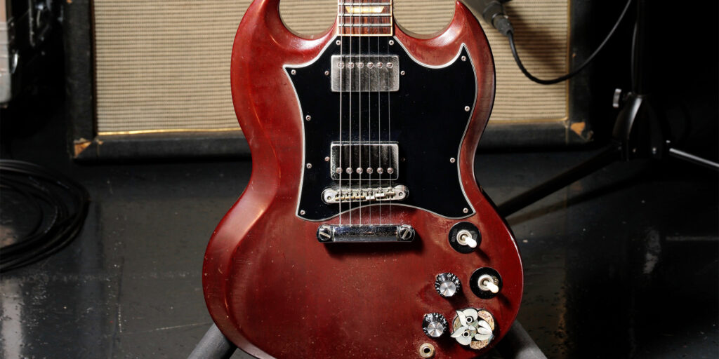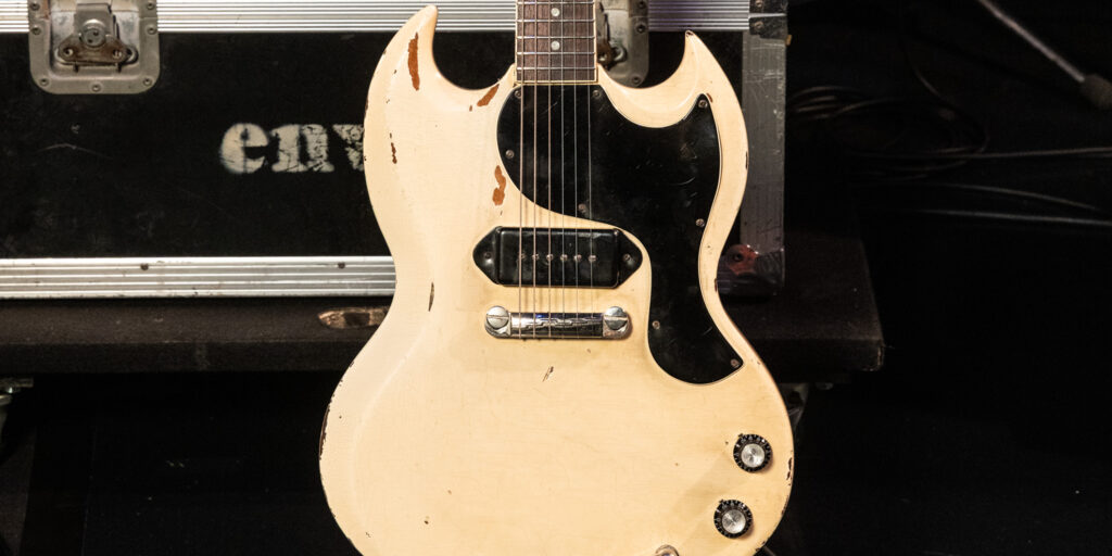 メイン・ギターはレアなポラリス・ホワイトの65年製SGジュニア。長年弾き込まれてきたことが一目でわかる、年季の入ったルックスが魅力的です。