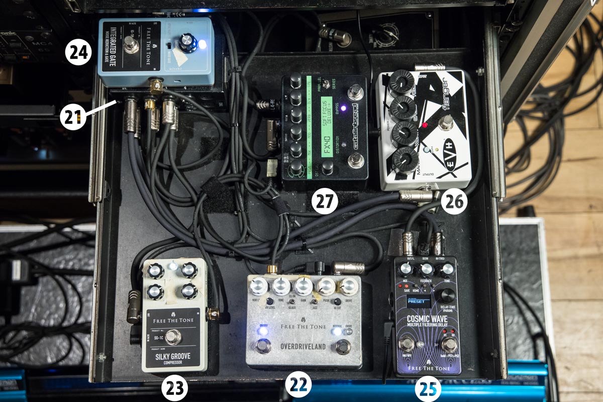 こちらはクリーンサウンド用のアンプ、Two-Rock Classic Reverb Signatureにつながるペダル。今回新しく導入されたのは㉖MXR EVH 117 Flangerと㉗Catalinbread Soft Focus Deluxe。