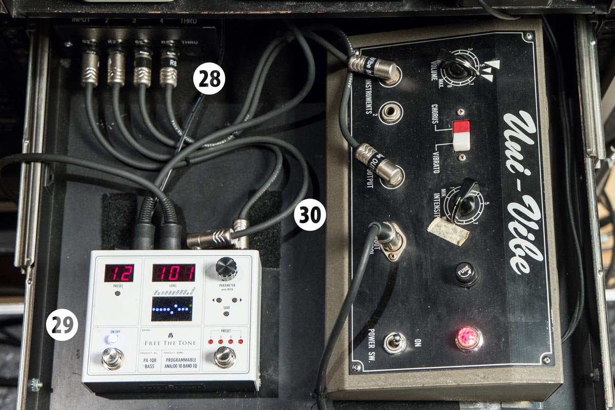 こちらもクリーンサウンド用のTwo-Rock Classic Reverb Signatureにつながるエフェクターで、㉙PA-1QBは常にオン。㉚Uni-Vibeはステージ上の足下に置かれた㉜エクスプレッションペダルでコントロール。ビンテージエフェクターではあるが、非常にコンディションの良い1台だという。