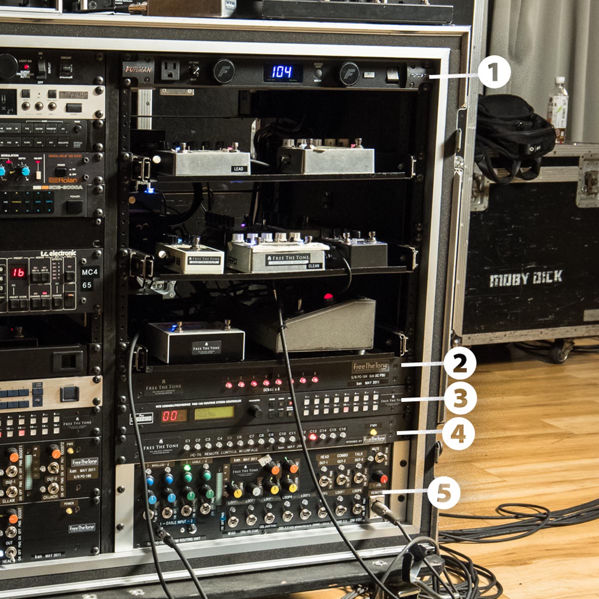 ①PL-Plus DMC Jはラック内の各システムへ安定した電源を供給。②PC-184はエフェクター専用の電源ユニットで9.6Vの電流を供給。③PMS-16UはMIDIペダルの信号をコントロールして、カスタムルーティングユニット(⑤)に入力。④PC-76はデジタル信号とアナログ信号のグラウンドを完全に分離するためのユニットで、これによりピュアなギターサウンドを出力することができる。
