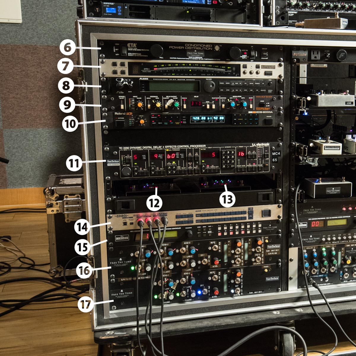 ⑤はシステムの中心になっているFREE THE TONEのルーティングユニット。ギターからの信号はまずここに入る。ケーブルインプットが2つ、ワイアレスインプットが2つ(裏側に入力あり)用意されているほか、ワウペダルを含むエフェクター類も8系統のループにつながっており、ここからアンプへと接続される。