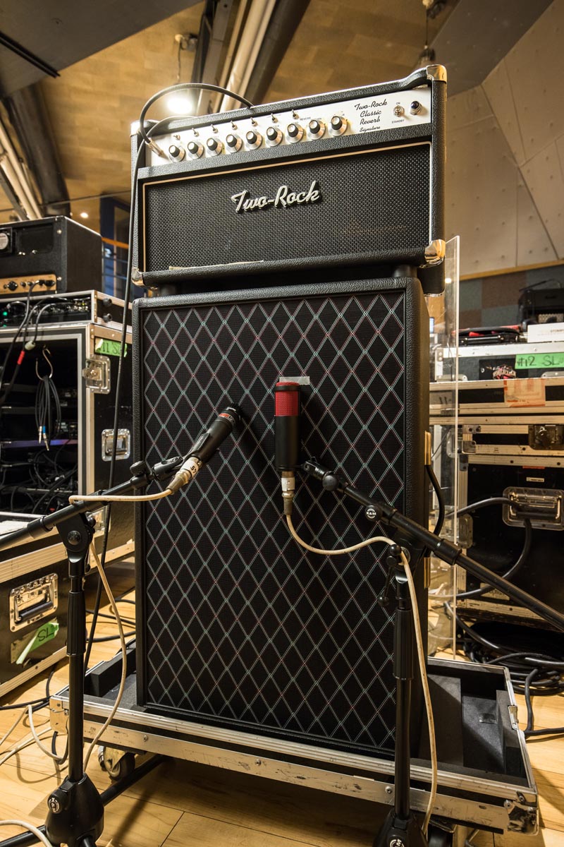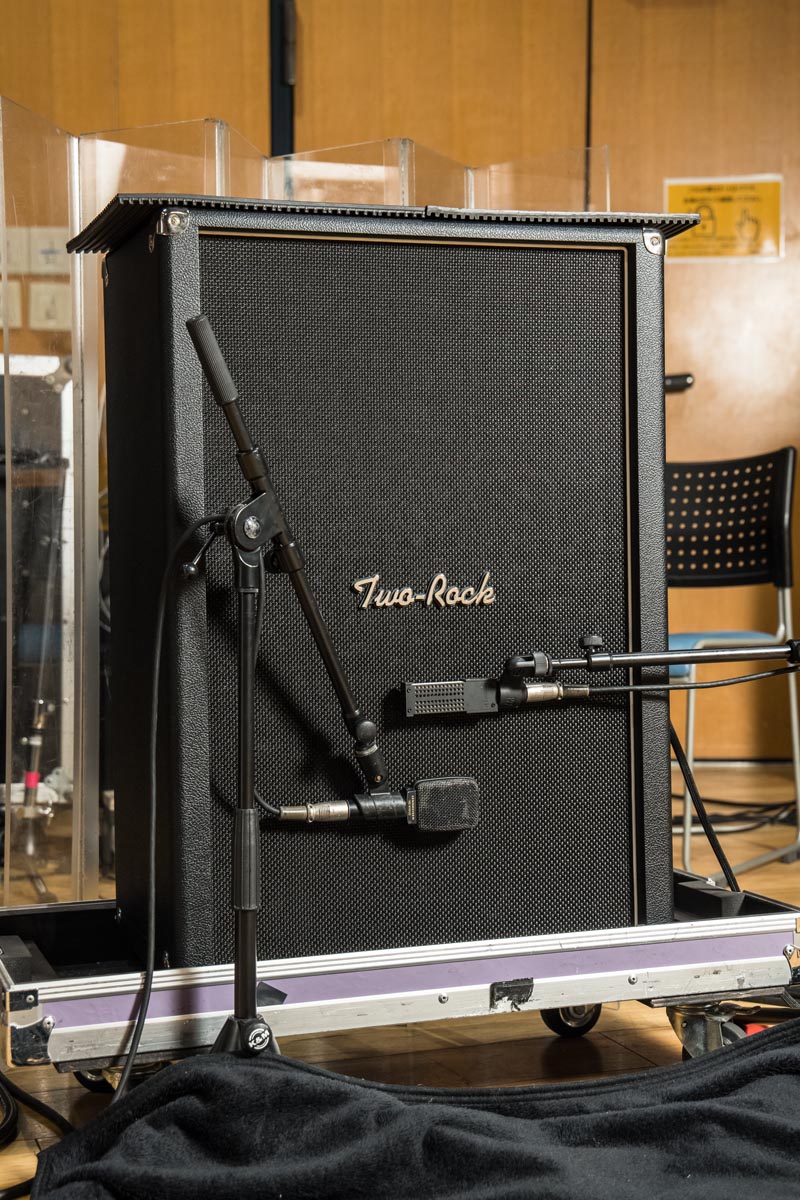 クリーン用のアンプはTwo RockのClassic Reverb Signature。下にあるKerry Wrightの2-12オープンバックキャビネットで出力している。スピーカーはCelestionのG12M-65Creambackだ。
