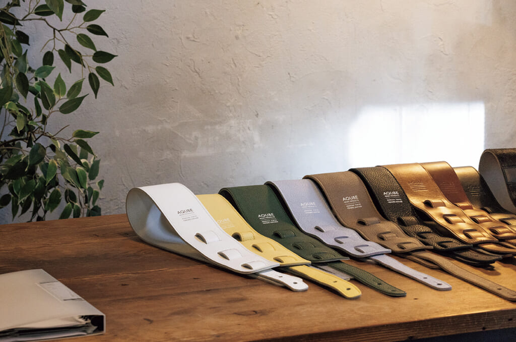 アイテムにはすべて、高級感溢れる上質な天然皮革を採用。今までの楽器用ストラップにはないデザイン性と機能性をあわせ持ったアイテムを取り揃える。