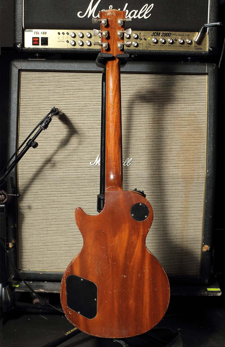 2013年に発売されたLes Paul Signature “T”。ウェイト・リリーフ仕様の軽量マホガニー・ボディが特徴で、指板はグラナディロが採用されている。ペグはGroverのロック式で、ボリューム・ノブをプルするとコイル・タップも可能。