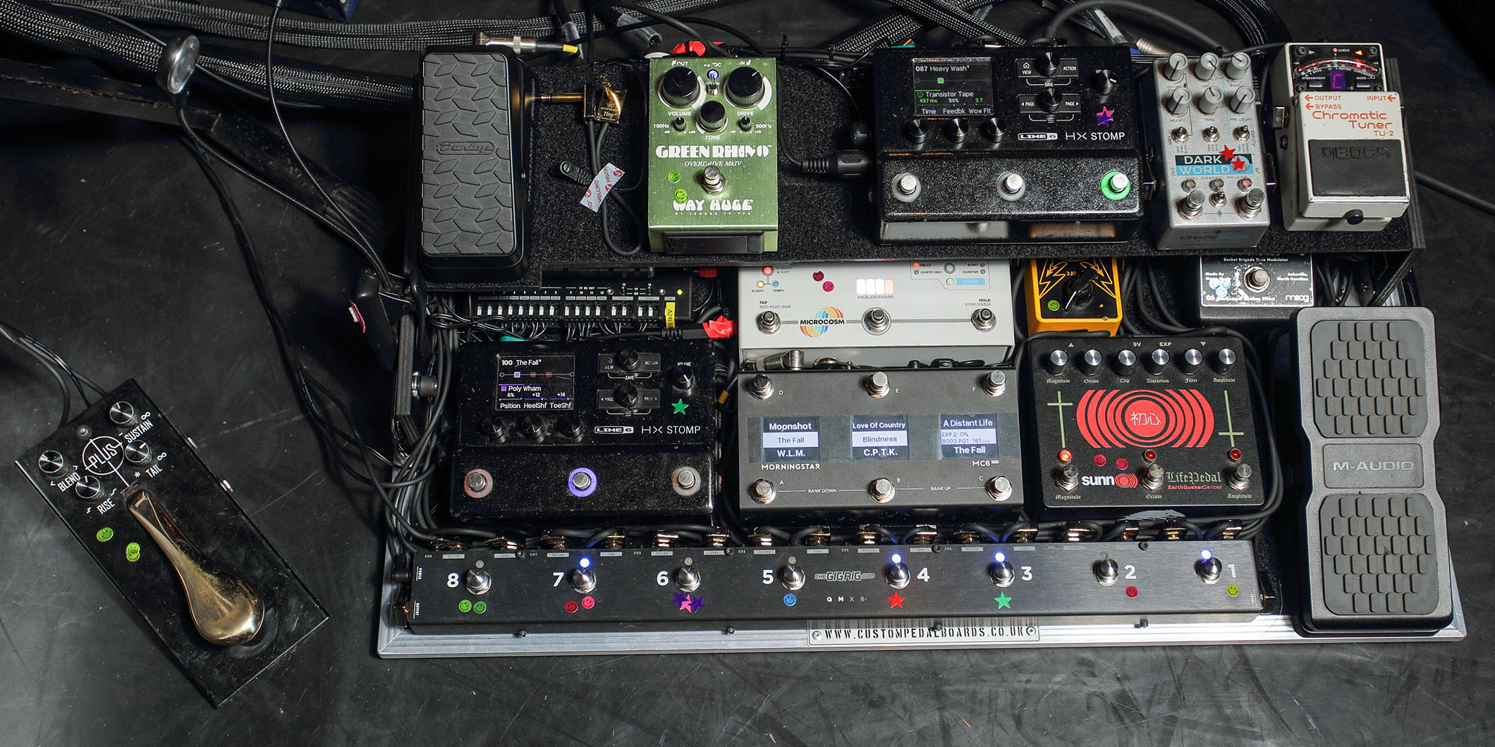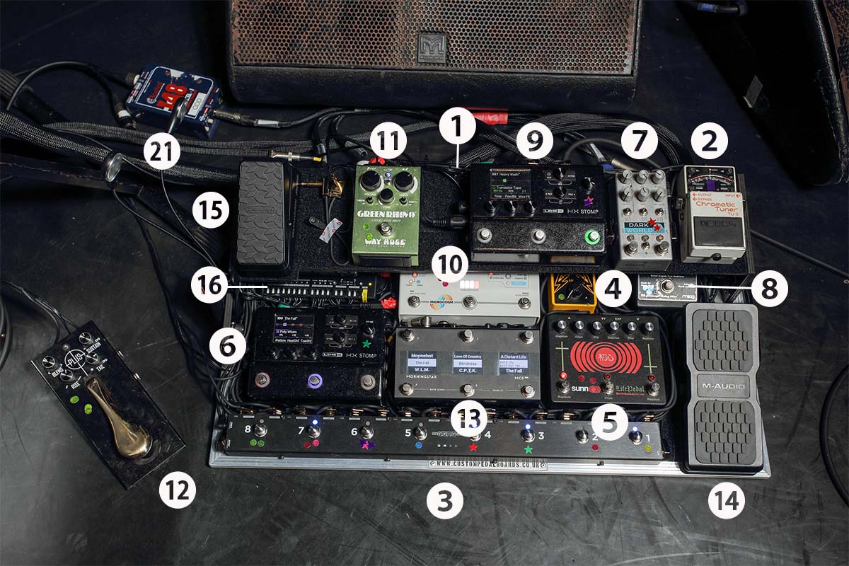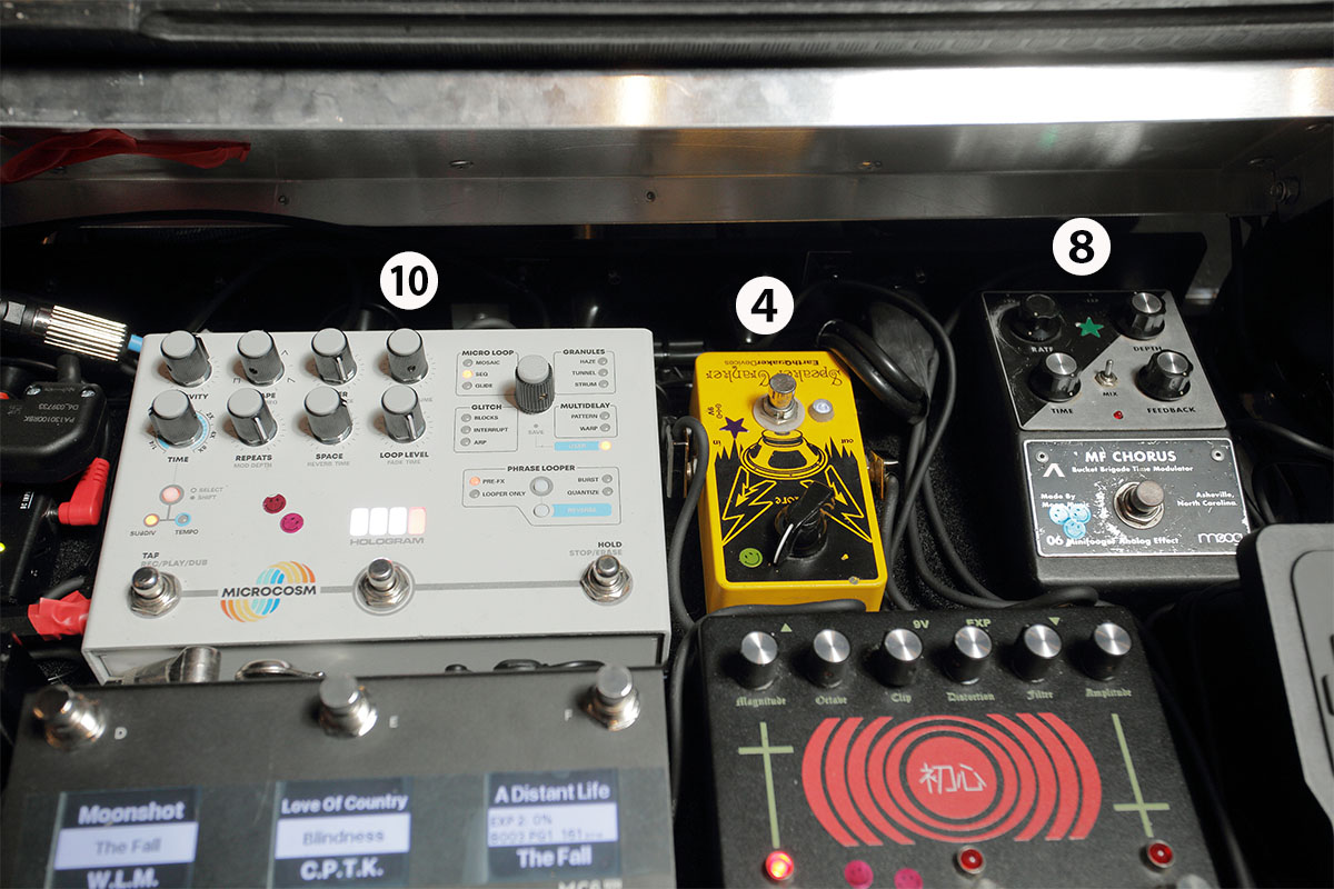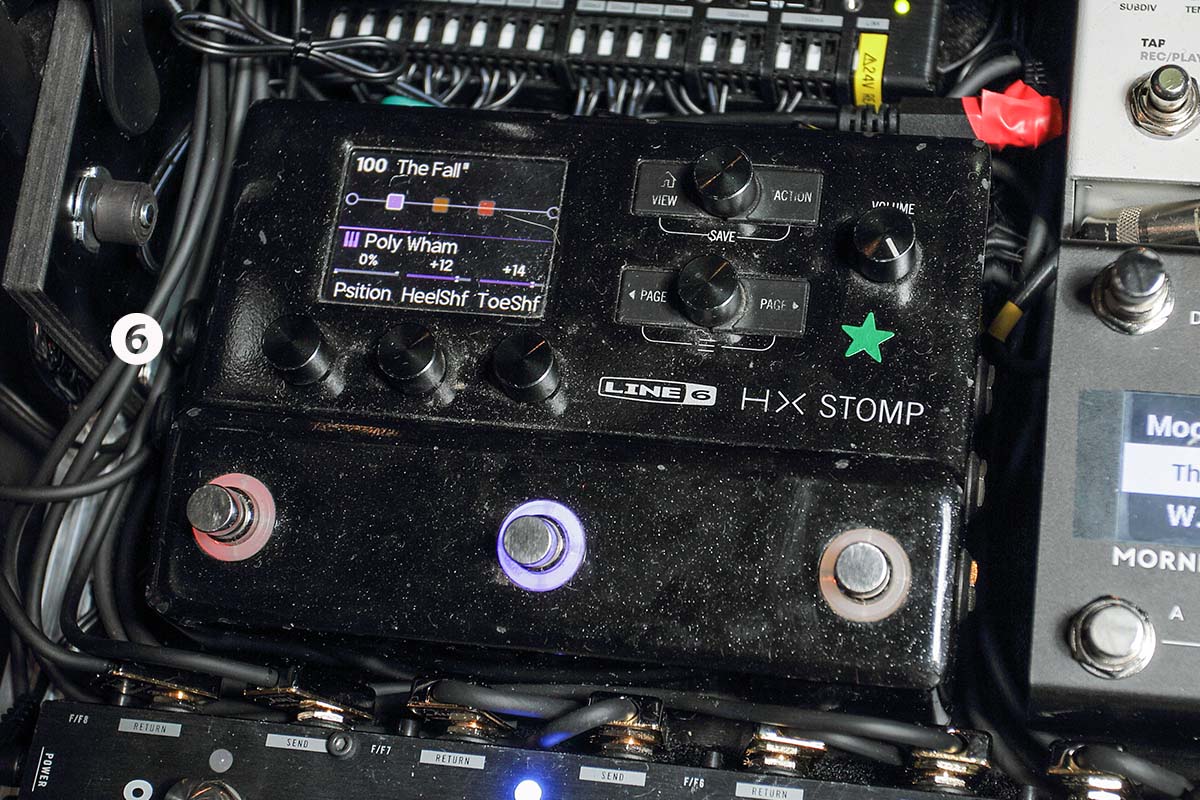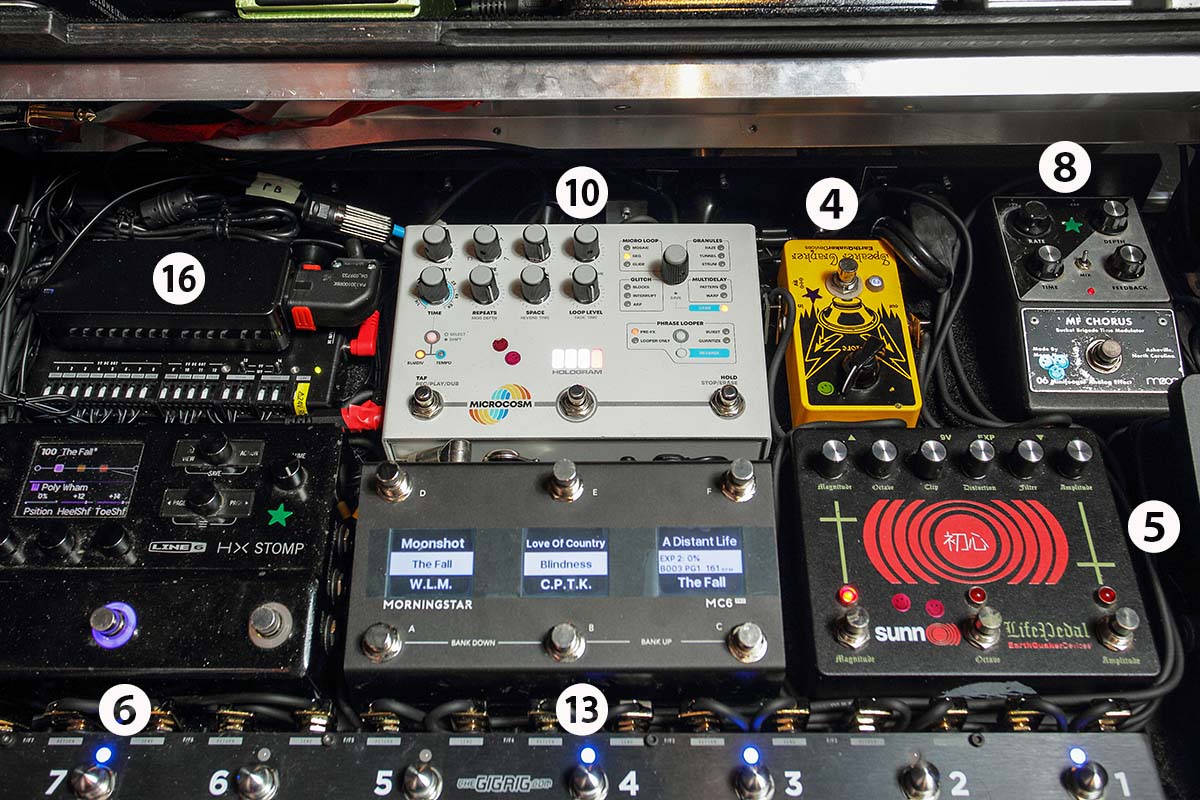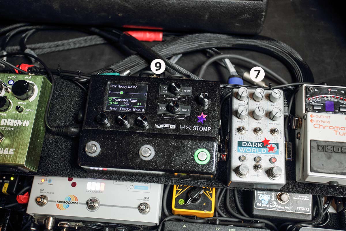 ⑥⑨HX Stompが2台用意されており、どちらにもモジュレーション、ピッチ・シフター、ディレイをプリセットしている。⑭EX-Pは⑥に接続。「The Fall」では⑤HX Stompのピッチ・シフターと⑦Dark Worldを同時にオンにし、さらに⑤HX Stompのピッチ・シフターを⑭EX-Pで操作している。「The Stars Will Leave Their Stage」では⑥HX Stompのリング・モジュレーターと⑩Microcosmを組み合わせることもあるそうだ。「Crying」では⑥HX Stompのトレモロを⑭EX-Pで操作し、同時にE-Bowも使用する。