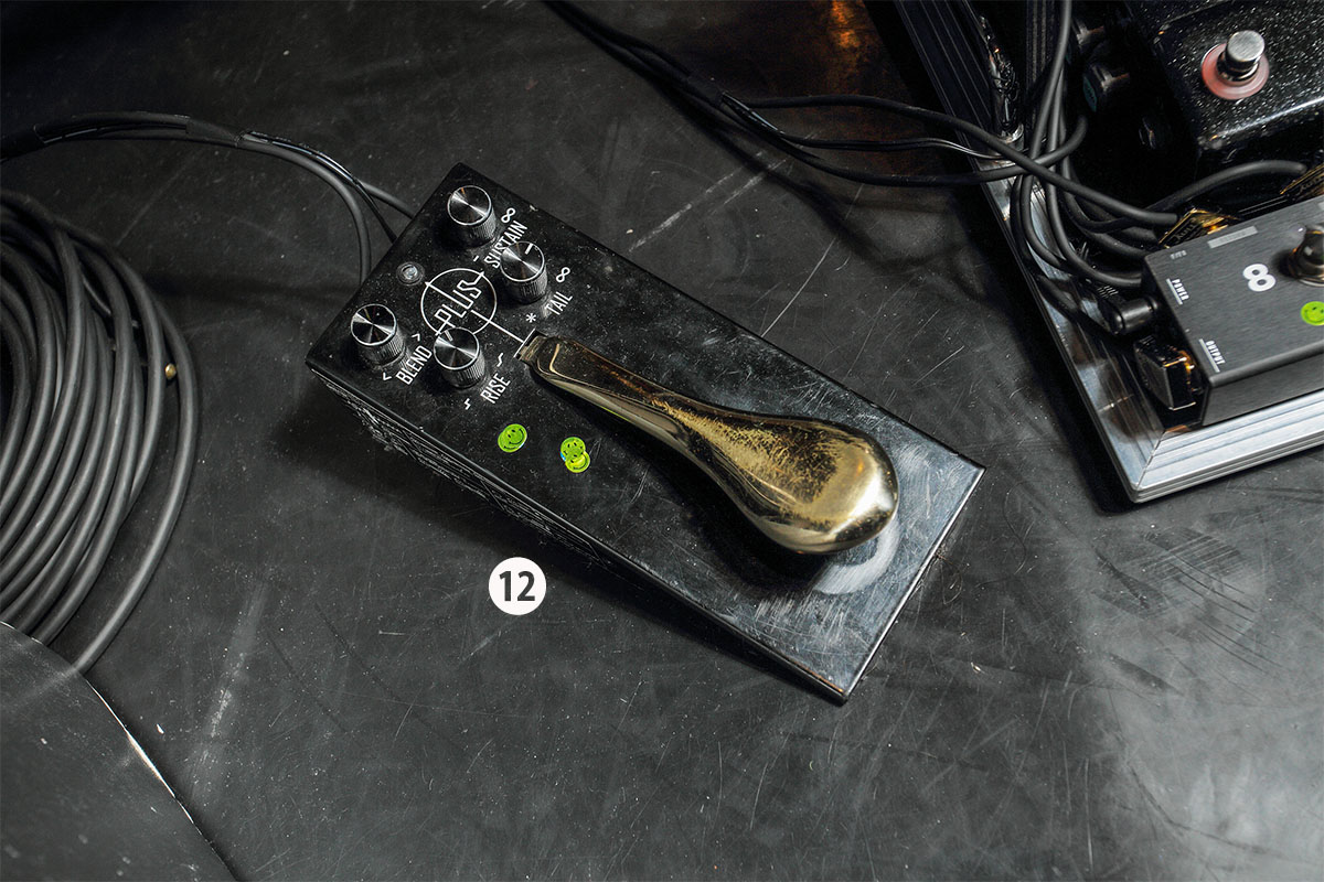 ⑫PLUS Pedalはクリーンで鳴らす小さい音量のハーモニクスを伸ばすためのもの。音量を持ち上げるために⑪Green Rhino Overdriveも同時に使うことが多いとのこと。