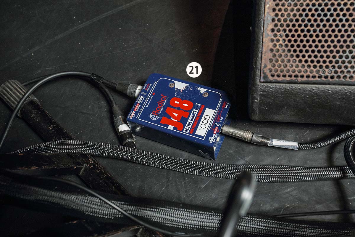 ダミアンの立ち位置の左側には台が置かれ、そこにセットされていた機材類。ここの機材はギターとは関係なく、⑰Blackboxから⑱Rubberneckと㉑J48を通ってPAに信号が送られている。