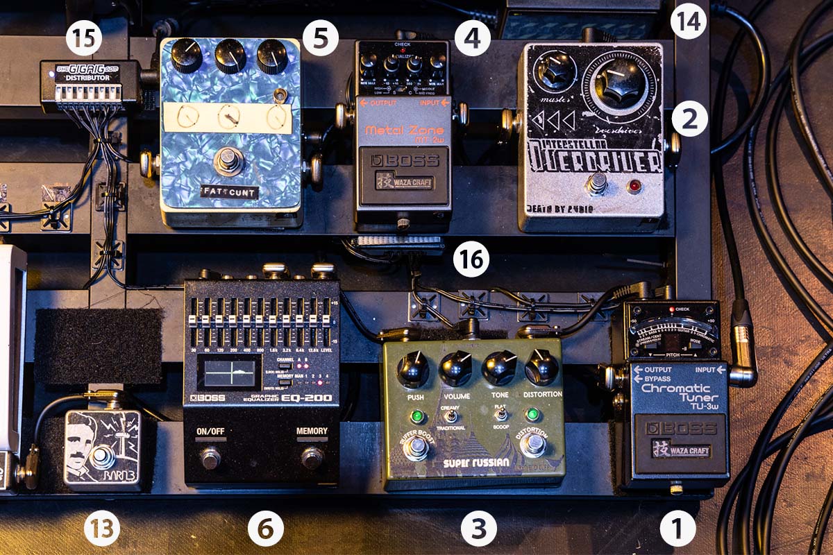 ②INTERSTELLAR OVERDRIVEは粗いサウンドが気に入っており、本機でクランチを作っている。ライブ中は踏んでいる時のほうが多いとのこと。