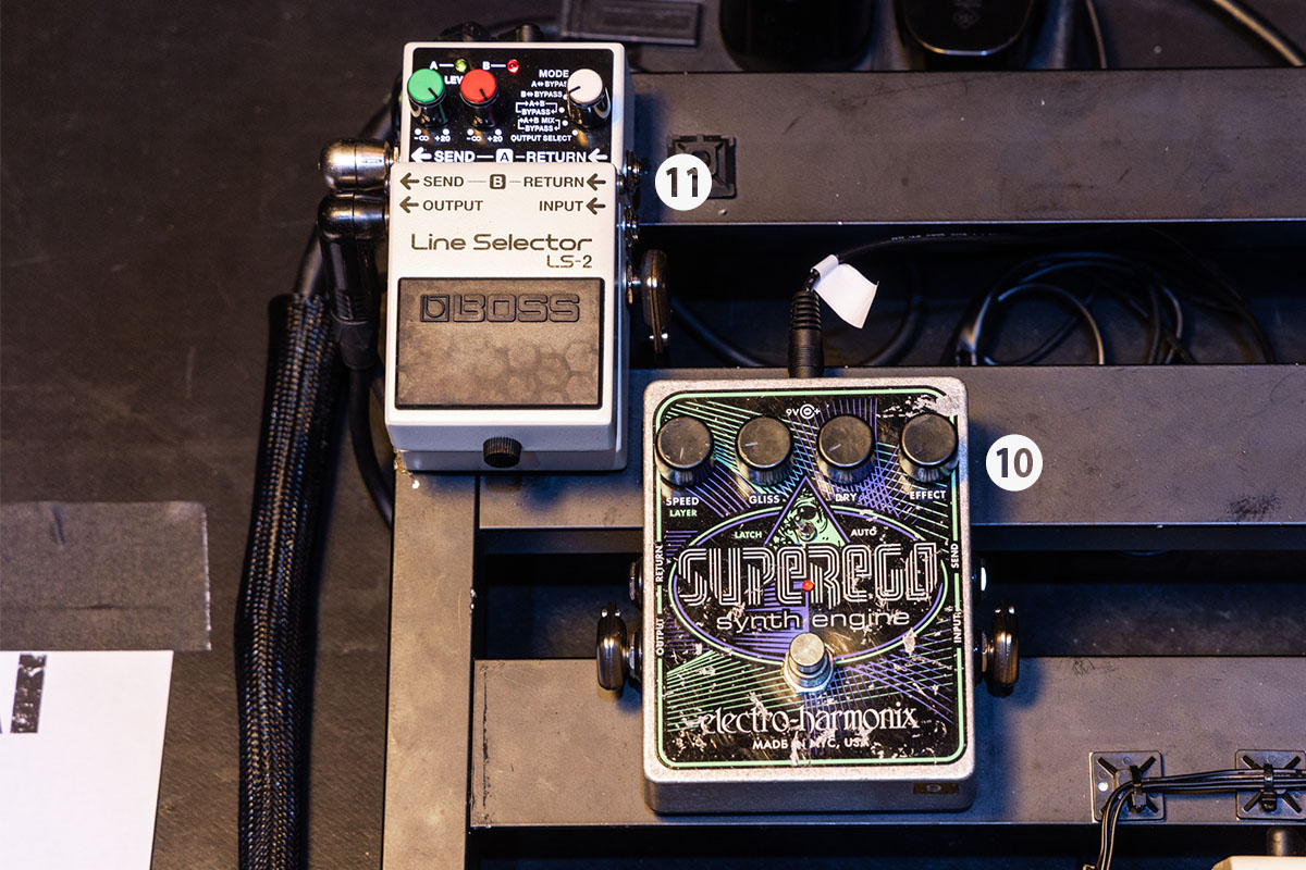 ⑪LS-2は“A+B MIX⇔BYPASS”モードに設定。本機は基本的にミュート用で、リバーブやディレイの残響を切りたい時にキル・スイッチのような役割でオンにするというが、この日のライブ中は踏んでいなかったと思われる。2本のシールドがつながれているが、片方は予備として接続されているだけ。