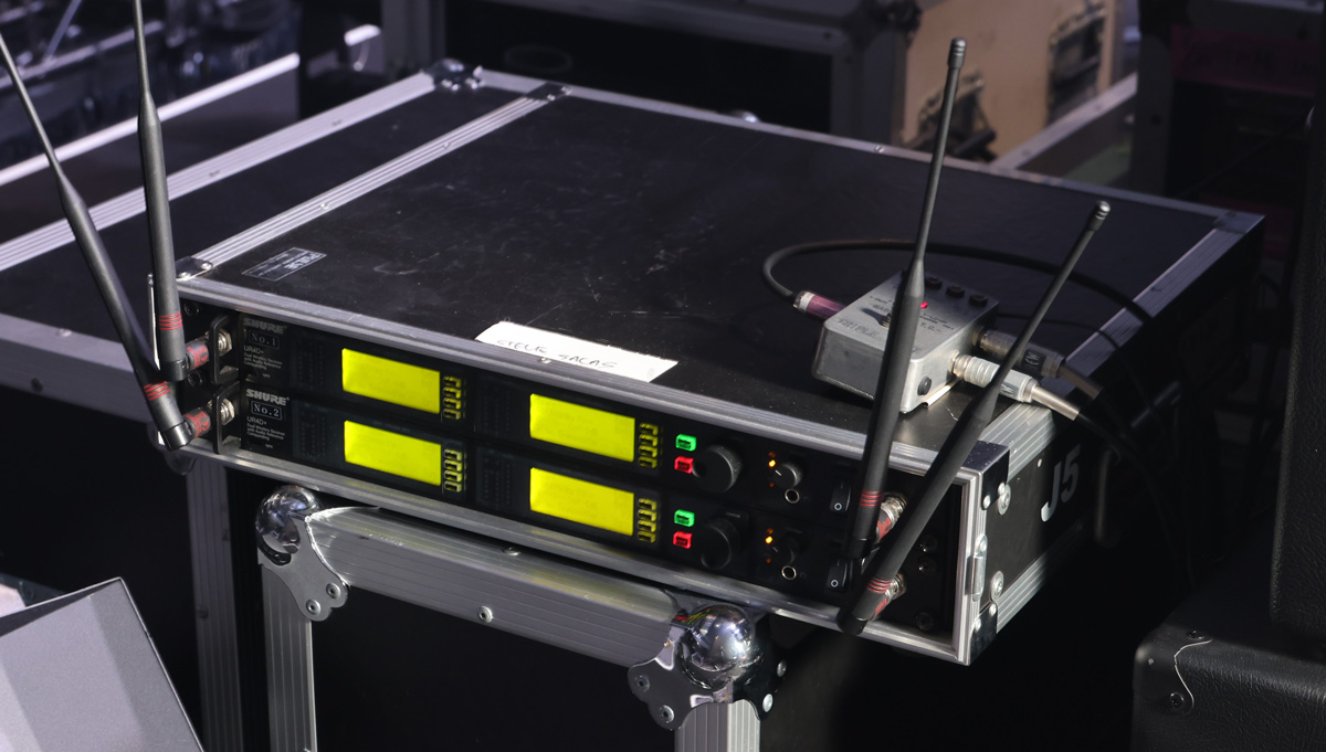 ワイアレス・レシーバーはShureのUR40+を2台使用。上がアコースティック・ギター用、下がエレクトリック・ギター用だ。