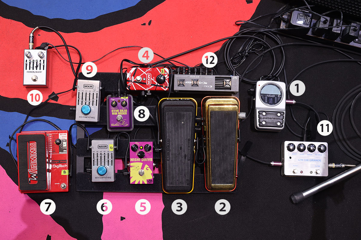⑤Nishi Driveはスティーヴィー・サラスのシグネチャー・オーバードライブ。⑩Rockaway Archerはライブ当日に追加されたものとのこと。どちらもアンプの歪みをプッシュするブースターとして使用していたと思われる。