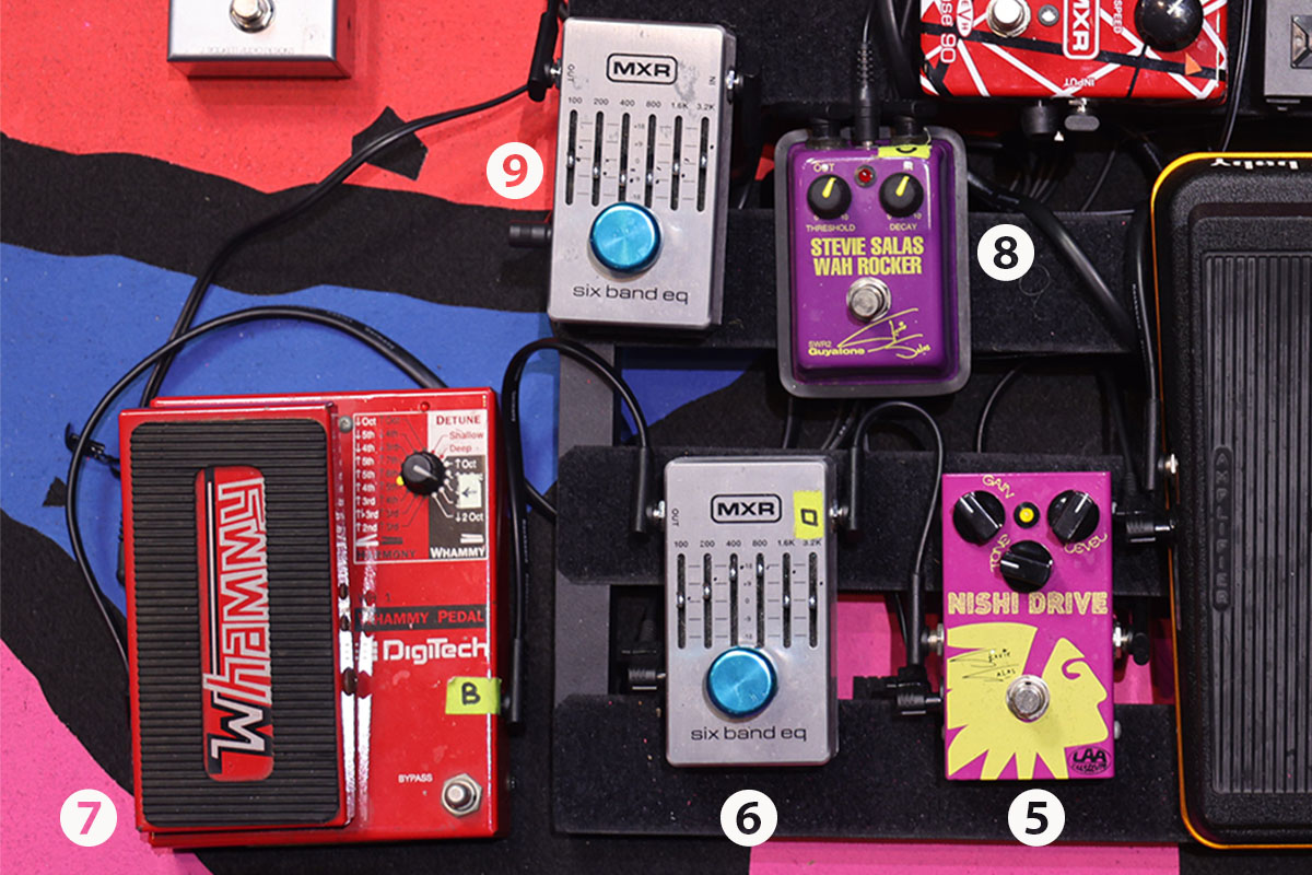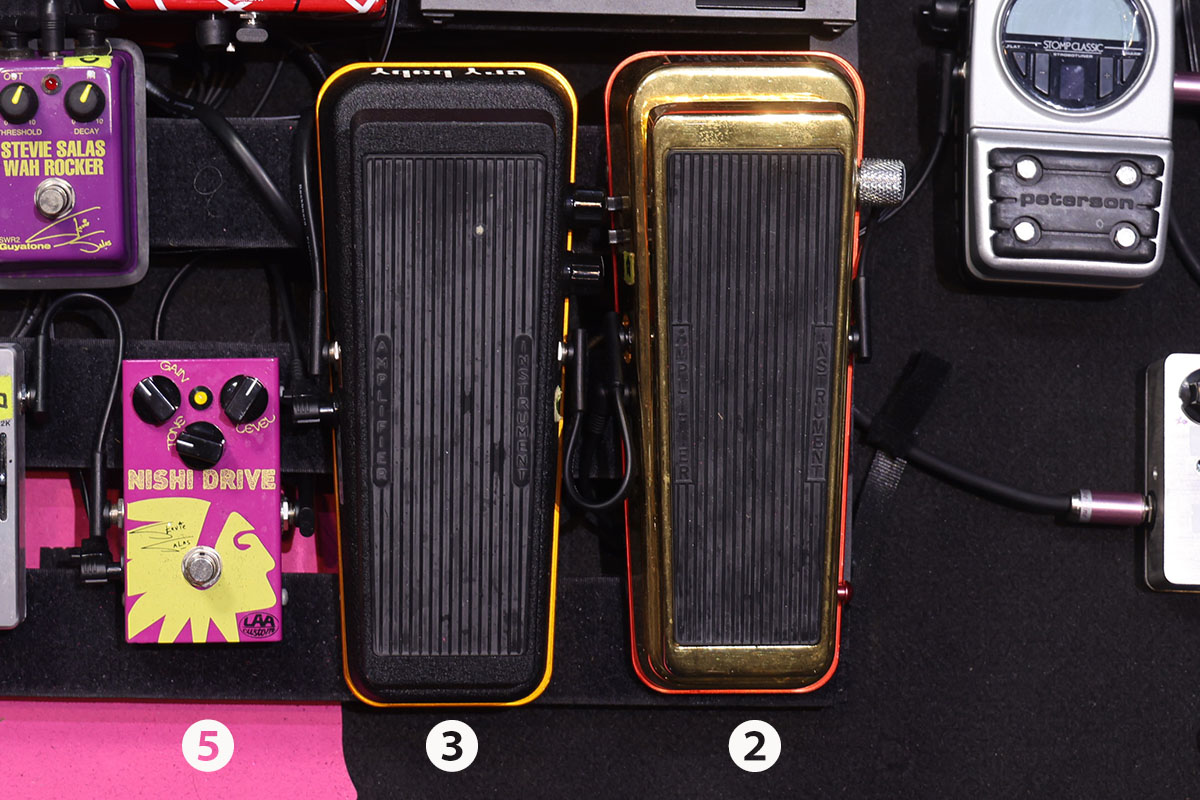 ④EVH Phase 90は「DRIFT」と「ERROR MESSAGE」で、⑦Whammy WH-1は「正面衝突」で使用。②535Q Cry Babyは様々な楽曲のギター・ソロで大活躍していた。