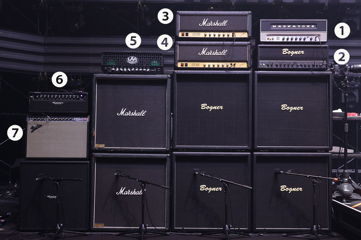ヘッドが6台、キャビネットが7台、コンボが1台用意されていたが、実際に使用したアンプは①Super Fifty-Nine M-80、⑤PO100、③JCM800 2203、⑦’65 Deluxe Reverbの4台。