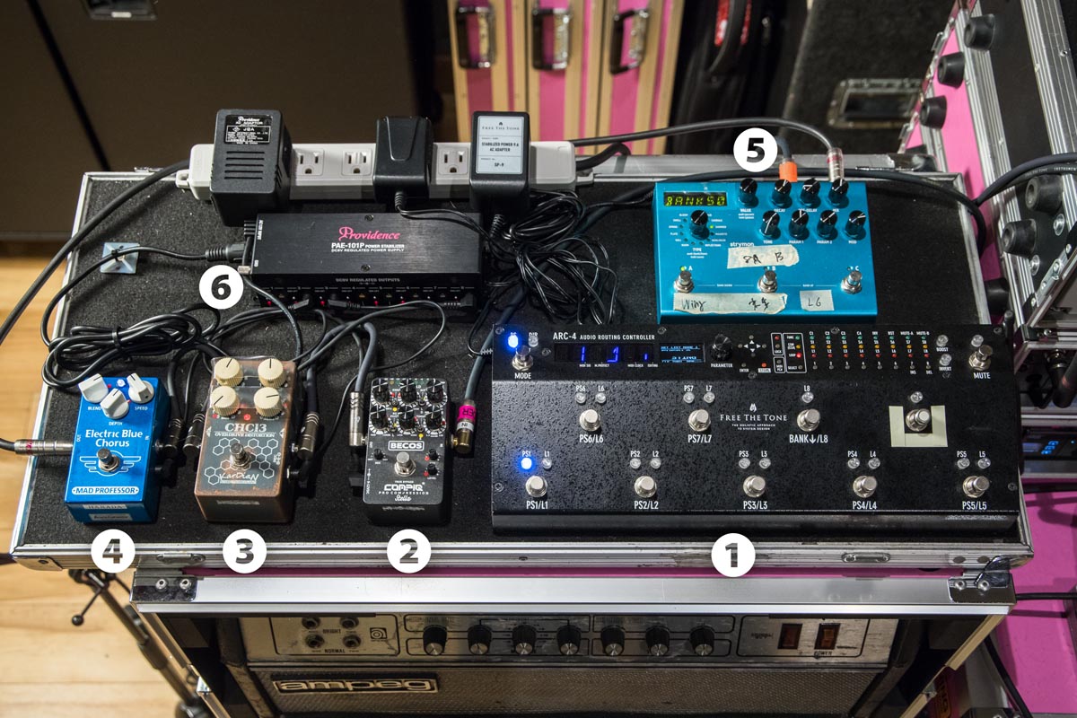 tetsuyaのベースヘッドの上に設置されたギター用エフェクター。①ARC-4があるが、各エフェクターはARC-4を介さず、直列でつながれていた。接続順は②〜⑤の番号順となっている。