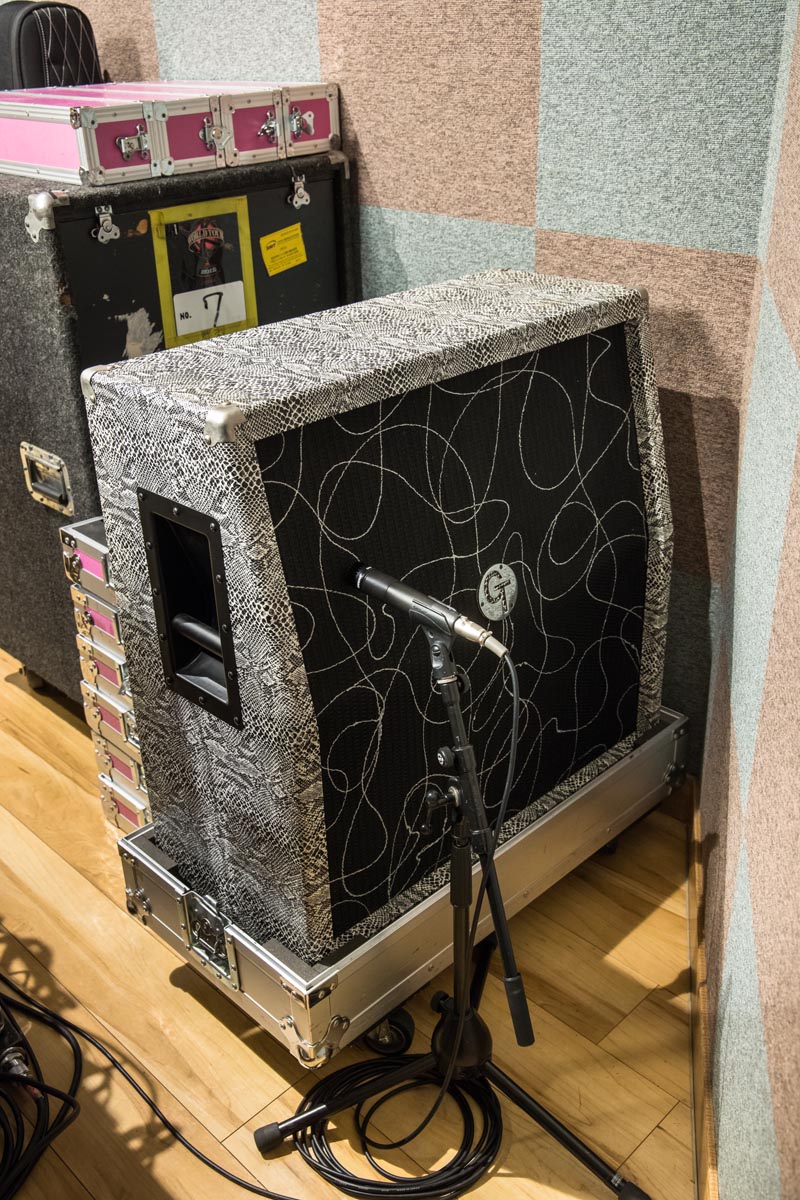 キャビネットはGroove Tubesの4×12 Cabinet。スネーク柄のインパクト強いルックスだ。本番ではステージ脇にセッティングされていた。