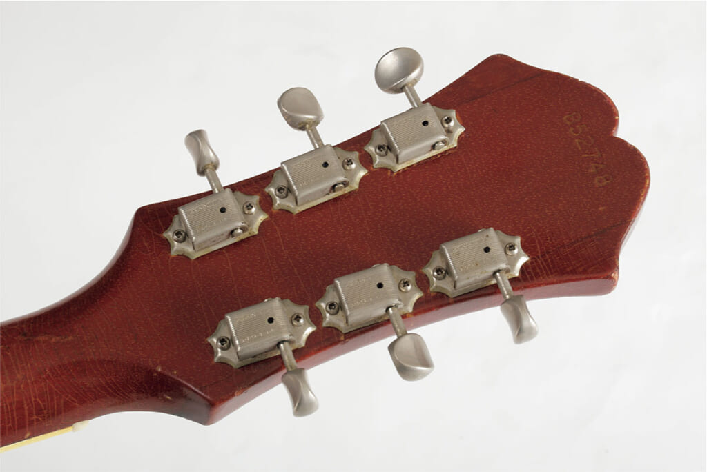現在でもお馴染みの細長いヘッド形状に変更されたのは63年。またこの頃ネック・インレイがひし形(オフセット・ダイアモンド)に、ピックガードが白に、そしてPUカバーが金属製(ニッケル)へと変更される。65年にはPUカバーのメッキがクロームへと変更されているが、ここは数多のビートルズ・マニアを悩ませるタネとして有名なポイントだ。65年製として知られるジョン・レノン&ジョージ・ハリソン所有のカジノは共にニッケル・カバー。つまり65年製カジノにはその両方が存在し、ドンズバを求めるマニアは血眼になって“65年製ニッケル・カバー”の個体を探す旅を強いられるからだ。なお同時期のギブソン製品同様、65年にはヘッド・アングルが17度から14度へと変更された。