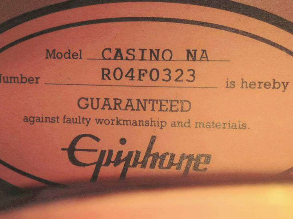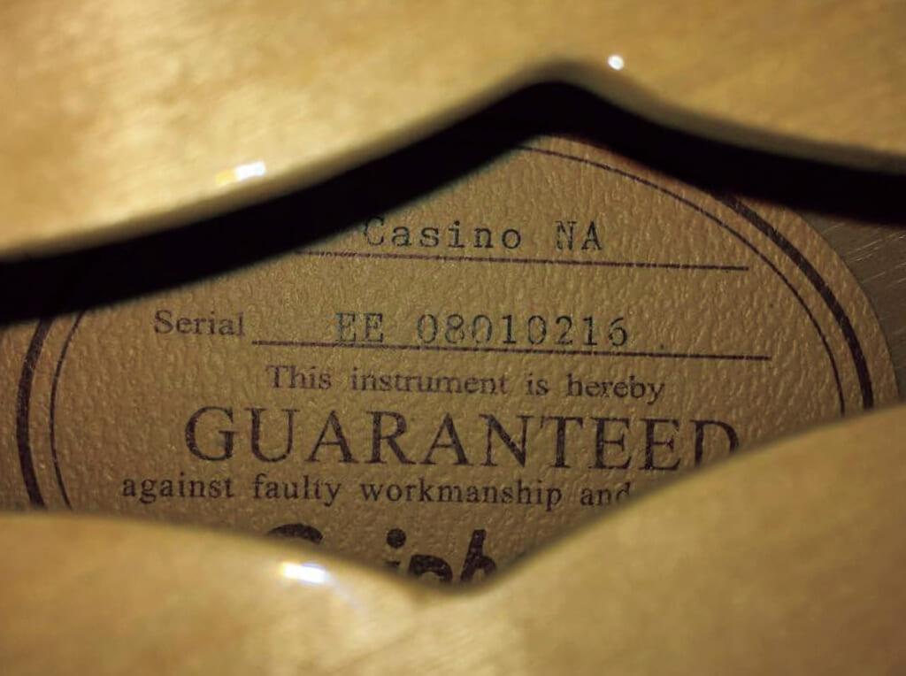 なお、韓国製・中国製を問わず、2004年までに製造されたレギュラー・ラインのカジノはすべて17フレット・ジョイント。それ以降はオリジナル・スペックへと回帰し、16フレット・ジョイントが採用されている。また製造時期によって若干の違いがあるものの、韓国製・中国製カジノはボディに使用されるラミネート板が(USA製/日本製と比べて)厚い材を用いるようになった。韓国で製造されたカジノ、それから中国で初期に製造されたカジノはいずれもオレンジ色の楕円のラベルが貼られていたが、2020年からはエピフォン・カジノのボディ内ラベルはブルーの四角いラベルへと変更。また大量生産に対応するためか、英数字11桁(もしくはそれ以上)のシリアル・ナンバー・システムが採用されている。