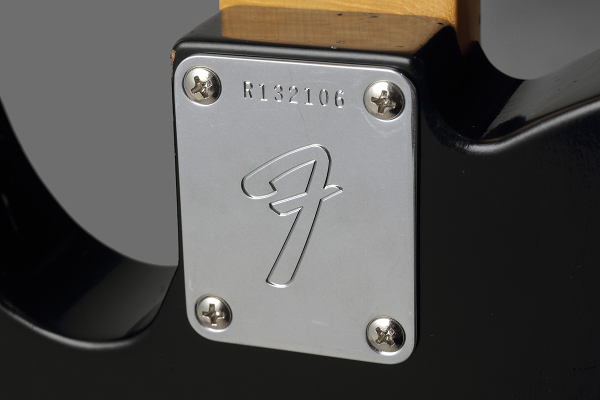 ネック・プレートにはFロゴの刻印が入る。Fロゴの刻印は65年から導入された。