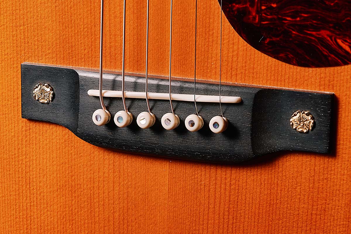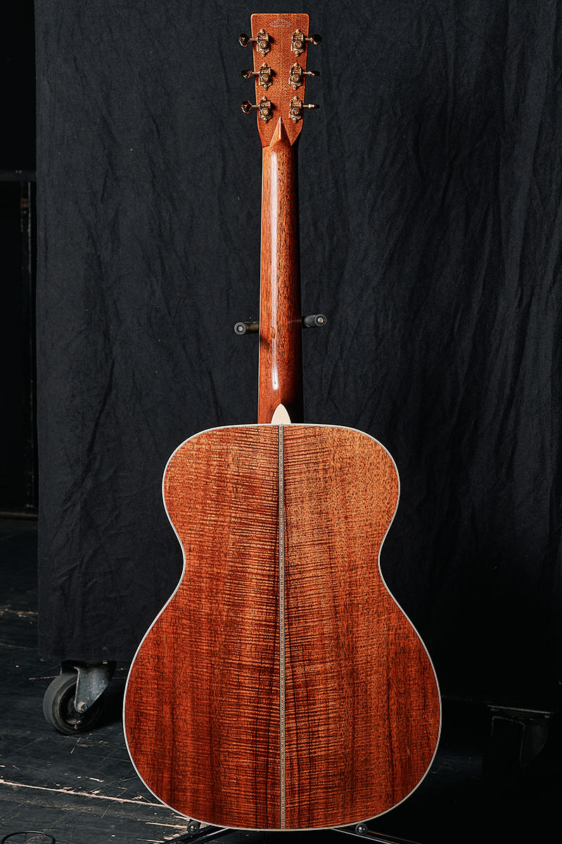 ボディ・トップはイタリア産のアルパイン・スプルース、バックとサイドはハワイアン・コアが採用されている。指板とブリッジはエボニーで、ブリッジにはgoro’sのゴールド・インレイが。