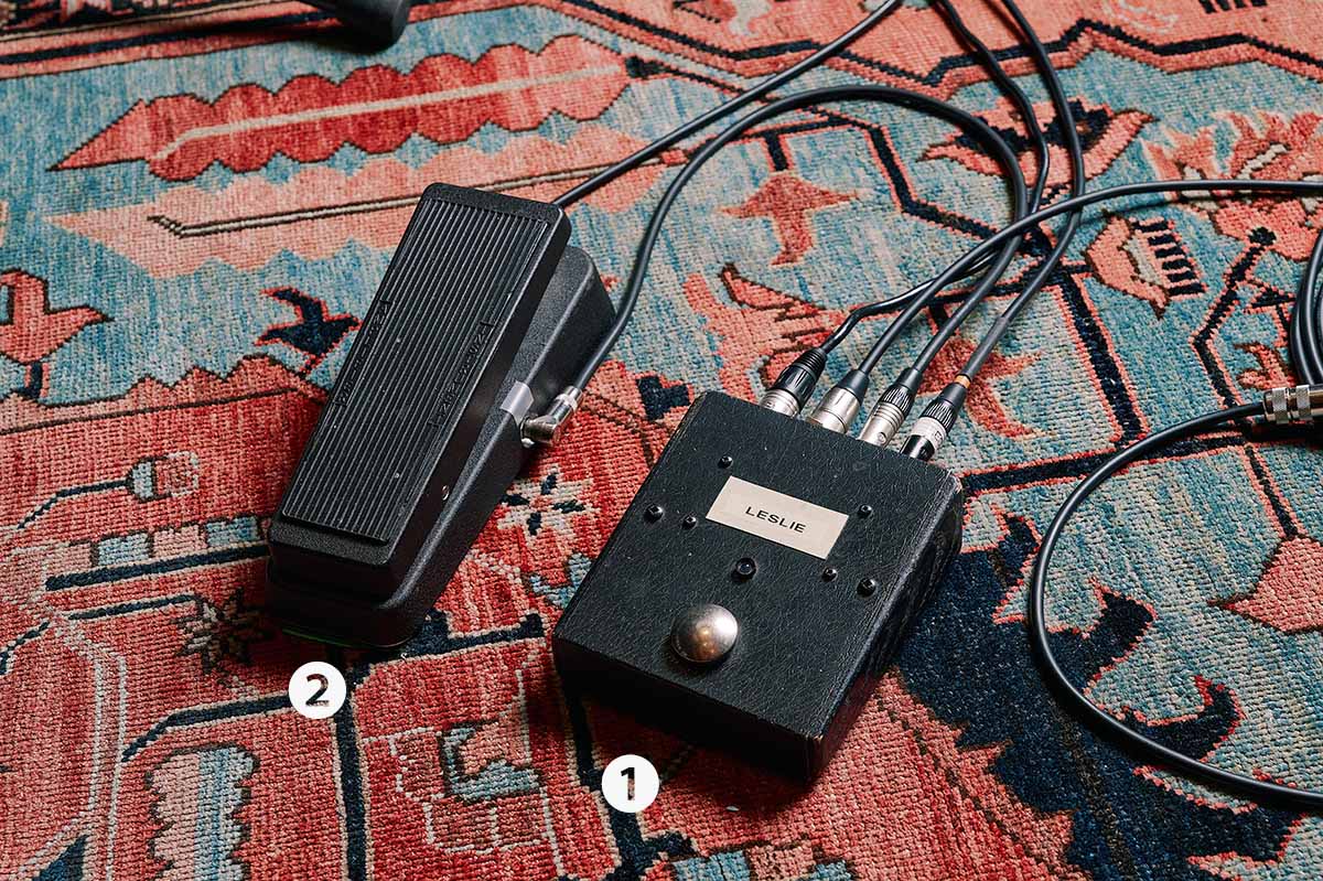 ギターからは、まず①にインプット。①はMike Hill Servicesが製作したレスリー・スピーカーのオン/オフ・スイッチで、インプット(XLRタイプ)のほかに2つのアウトプット(フォン・タイプ)も備えている。