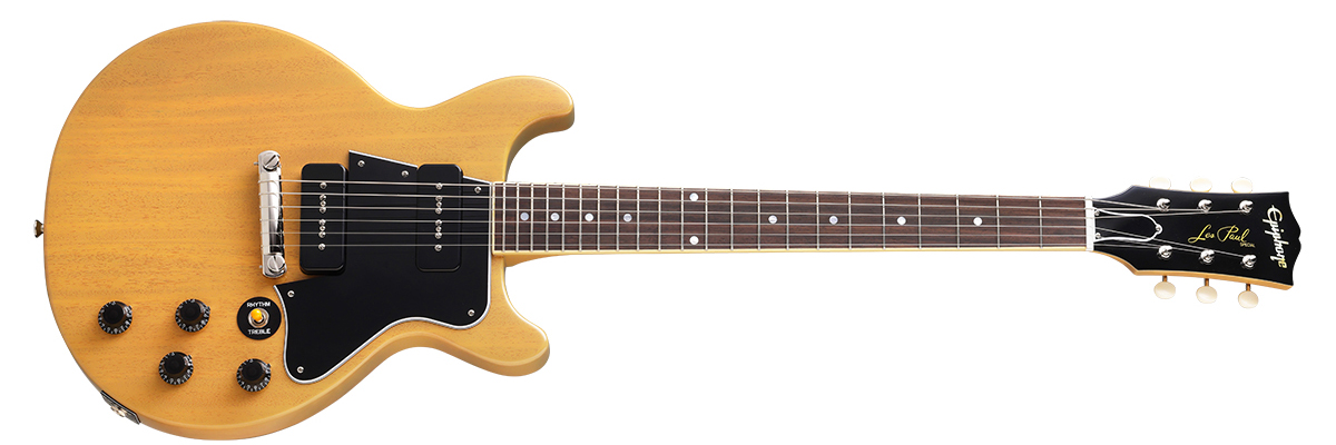 ダブル・カッタウェイ・ボディの1960年レス・ポール・スペシャルのリイシューが新登場。シリーズ初となるP-90搭載モデルで、ソープ・バー・スタイルのUSA製ピックアップがフロント&リアに採用されている。