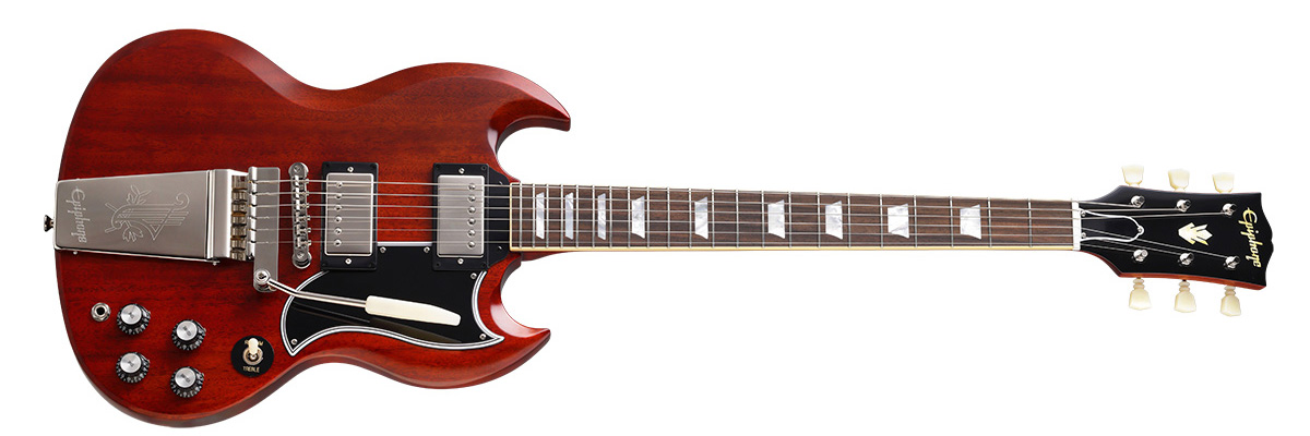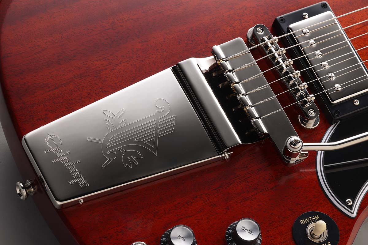 レス・ポールからSGスタンダードにモデル名が変更となり、テイルピースにいわゆる“板バネ”と呼ばれるマエストロ・ヴァイブローラを採用した1964年の人気仕様をリイシュー。