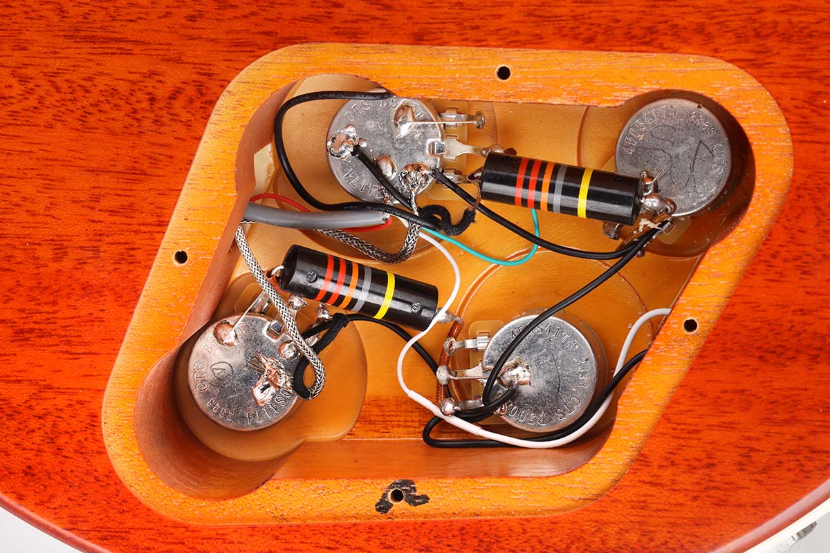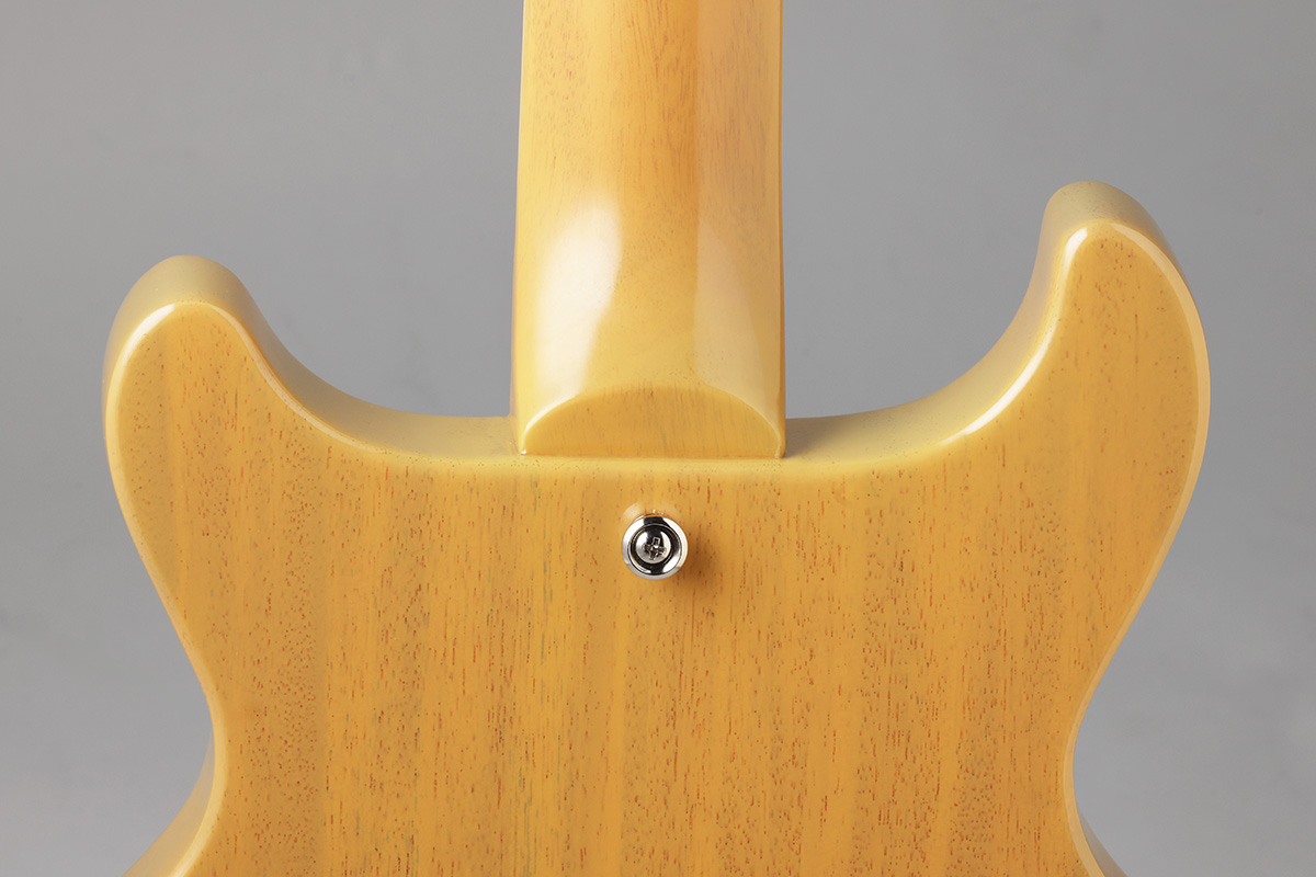 TVイエローのマホガニー・ボディは木目や導管が透けて見えており、ギブソン・ファンを納得させる仕上がりに。ラップアラウンド・ブリッジや、後期型の特徴である指板とフロント・ピックアップの間までをカバーするピックガードなど、60年製の仕様を徹底再現。