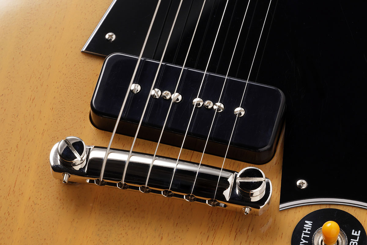 ボディの響きをダイレクトに伝える鳴りが特徴的なラップアラウンド・ブリッジを搭載。ソープ・バー・タイプのP-90は、もちろんUSA製だ。