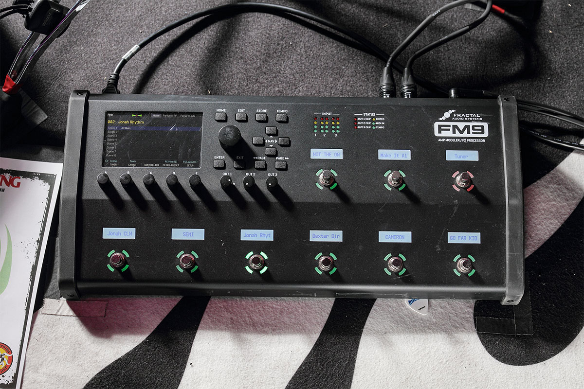 非常にシンプルなシステム。ギターからはワイヤレスを経由し、ジョナのステージ・ライザー下に置かれたラック内のShure / AD4Q(ワイヤレス受信機)へ。そこから足下のFractal Audio Systems / FM9(ギター・プロセッサー)に接続され、DIを経由してPAに信号が送られる。ちなみにAD4Qは日本でレンタルしたものだそう。