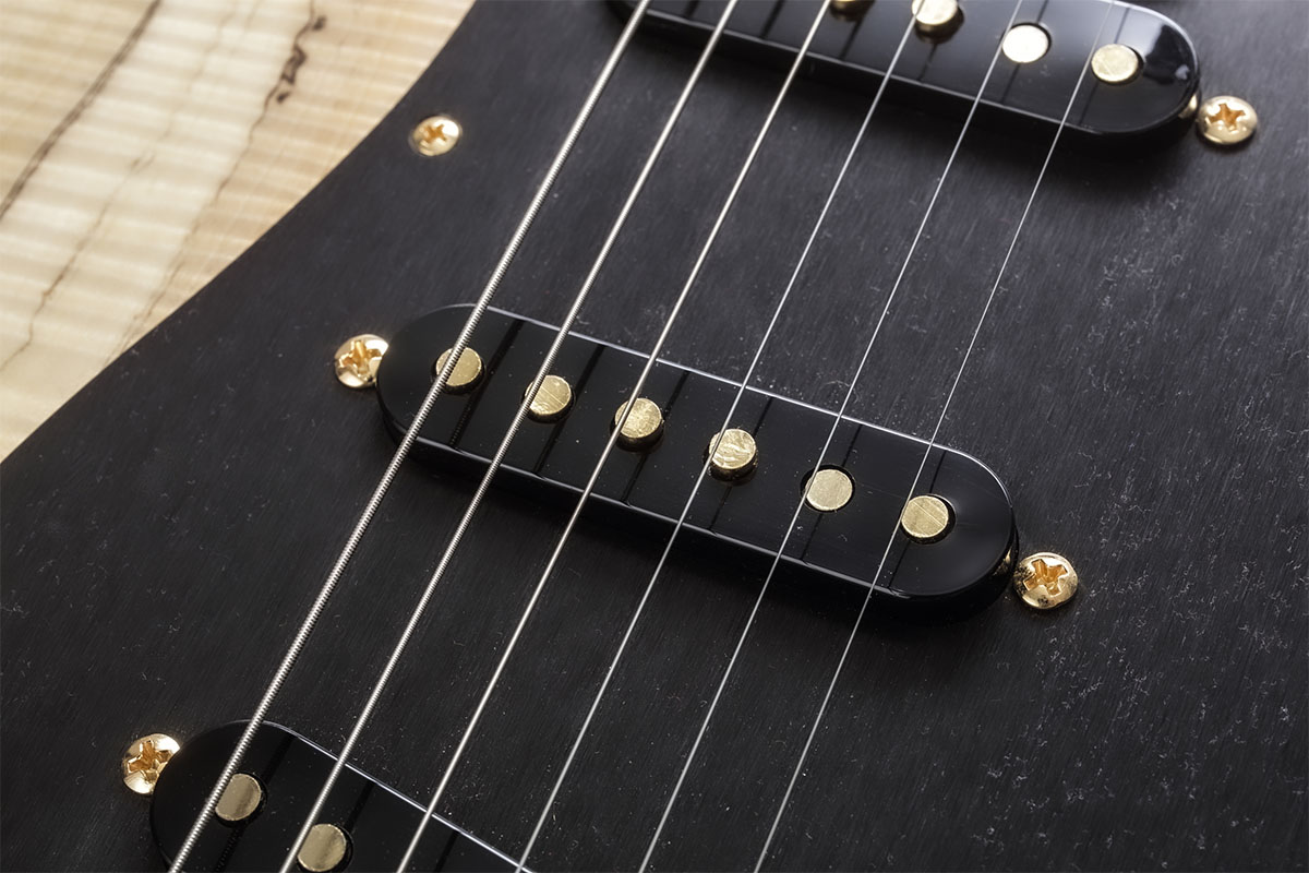 本器のサウンドは、トチノキという木材の“軽量でありながら、十分な密度を備えた特性“により、明瞭かつバランスの取れたものに仕上がっている。ピックアップはマスター・ワインダーのホセフィーナ・カンポスが手巻きした“Fat ’50s”を採用。マット・ブラックのピックガードに馴染むブラックのピックアップ・カバー、ボリューム・ノブ類のチョイスがエレガントだ。トチノキの木目と温かな色味、そしてそれを主役に引き立てるパーツ類のトータル・コーディネートに、シニア・マスタービルダーならではの技が光る。