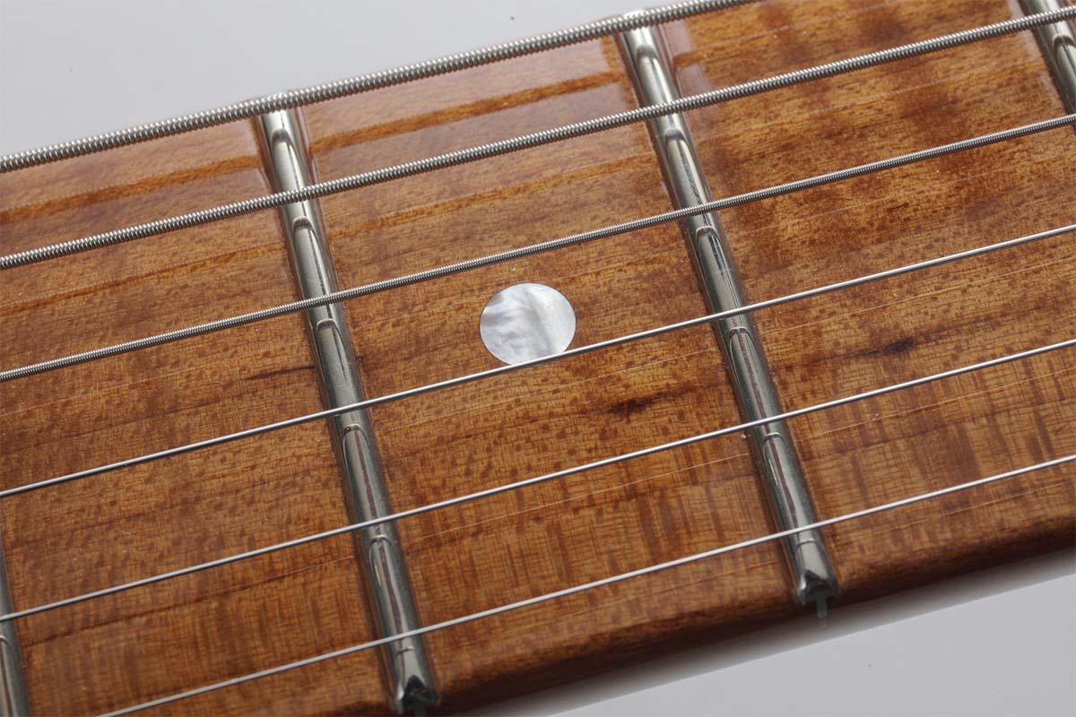 ネックは1本の木材から削り出された1ピース・メイプル。さらに最高級4Aグレードという、まさしくカスタムショップならではと言える贅沢の極み。熱処理により色の深みが増しても隠れない、あまりにゴージャスなフレイムにも目を奪われる。指板上のポジション・マークにさりげなくマザー・オブ・パールを用いる美意識も、このギターの見逃せないポイントと言えよう。