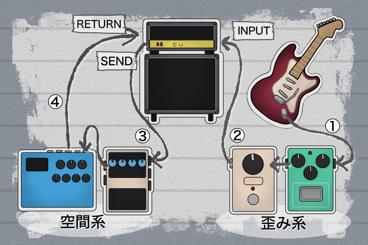 アンプで歪みを作る場合、アンプのインプットからすべてのエフェクターを入力すると、“空間系→歪み”の順番になってしまい、空間系がキレイにかかりません。なので、アンプで歪ませた音を一度センドから取り出して、そこに空間系をかけて、リターンからアンプに戻してあげるのです。