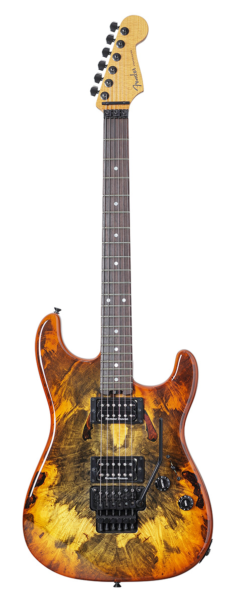 “エキゾチック・ウッド”と呼ばれる特別な木材の1つであるバックアイ・バールをボディ・トップ材に使用したストラトキャスター(バック材はアッシュ)。希少材ならではの独特の表情とミディアム・タバコ・バーストと呼ばれるカラーリングが、このギターに温かみと優雅さを与えている。ピックガード・レス&サイド・ジャックの仕様も、この特別なトップ材を主役に引き立てる。