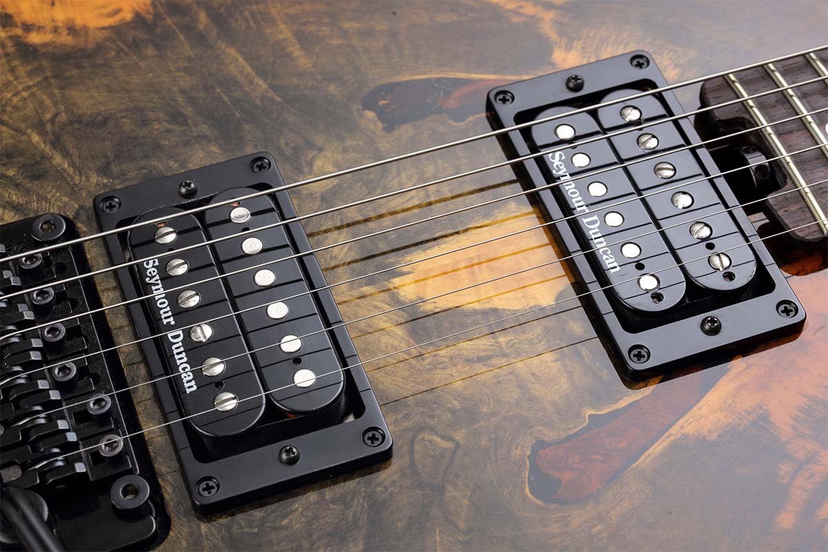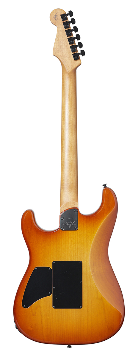 ハードウェアはストラトキャスターを基本としながらも、随所にモダンな仕様を採用。トレモロ・ユニットにはダブル・ロッキング構造のフロイドローズを搭載し、激しいアーミングにおいても高いチューニング安定性を発揮する。アーム・アップにも対応すべく、ブリッジ後端側のボディに落とし込み処理が施されている。ピックアップにSeymour Duncan製をチョイスし、フロントに’59、リアにJBというコンビネーションで幅広い音楽表現に対応。