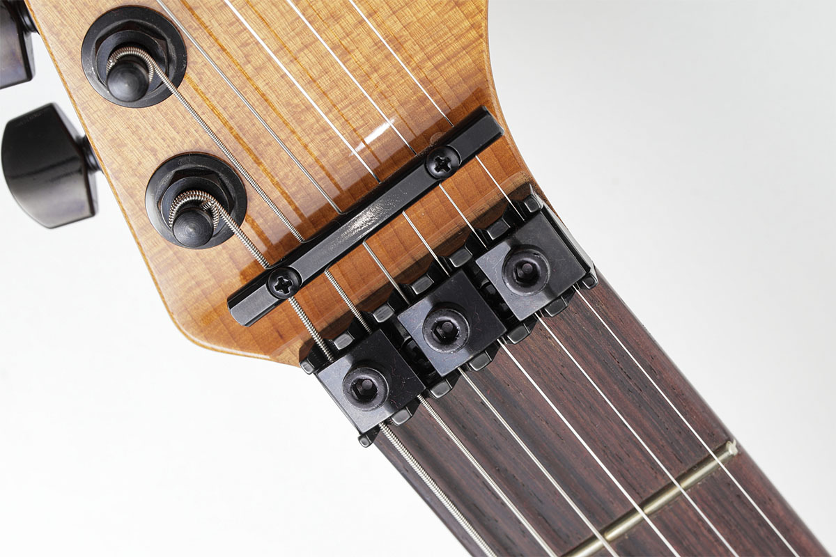 ロック式のナットが備わる。フロイドローズ搭載のため、大胆なアーミングでもチューニングが安定する。