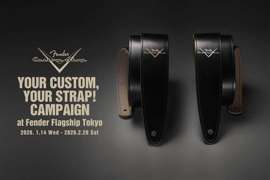 Fender Flagship Tokyoでは、2026年1月14日(水)〜2月28日(土)の期間、“Fender Custom Shop – Your Custom, You Strap! Campaign”を開催。期間中、店頭にてカスタムショップのギターまたはベース(カスタムオーダー製品を除く)を購入、もしくはカスタム・オーダーした方を対象に、日本原産・国内タンニングのリアル・カウ・レザー(牛革)を使用したオリジナル・レザー・ストラップがプレゼントされる。