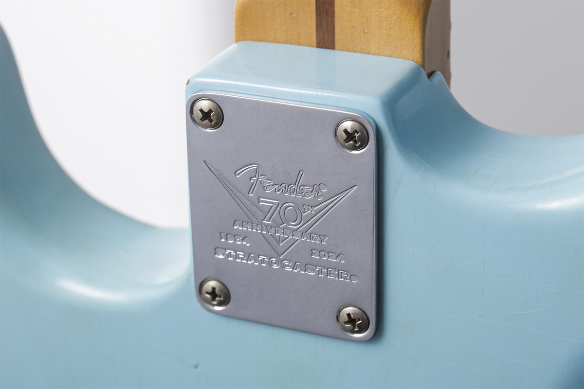 1954年に誕生したストラトキャスターの70周年を祝うアニバーサリー・モデル。中でも本器の魅力は、オーセンティックな1954年仕様を踏襲しながらも、印象的なブルーのカラーリングをまとっている点にある。マスタービルト・シリーズの70周年アニバーサリー・モデルがサンバーストを基調としている中で、このカラーは一際目を引く存在となっている。