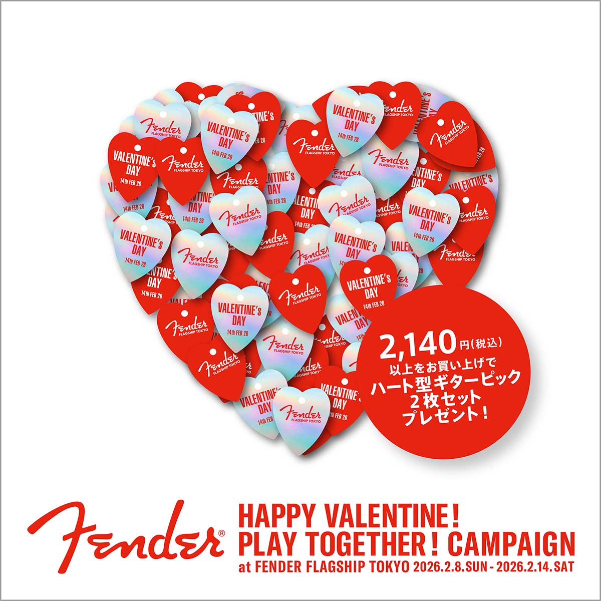 Fender Flagship Tokyoでは、2026年2月8日(日)〜2月14日(土)の期間、“HAPPY VALENTINE! PLAY TOGETHER! CAMPAIGN 2026”が開催される。期間中、店頭にて合計2,140円(税込)以上購入した方を対象に、バレンタイン限定デザインのオリジナル・ハート型ピック(2枚1セット/非売品)がプレゼントされる。