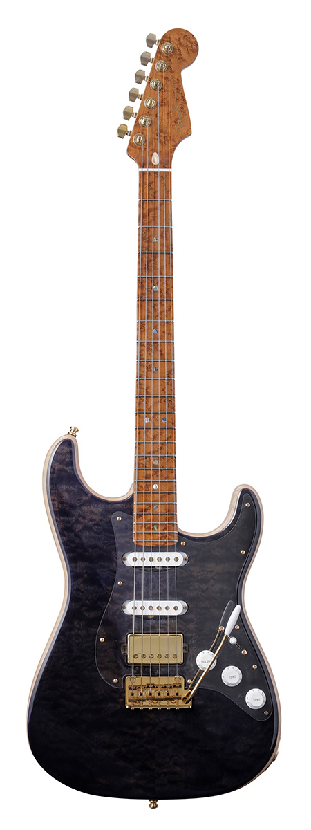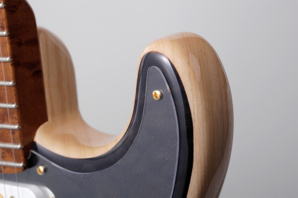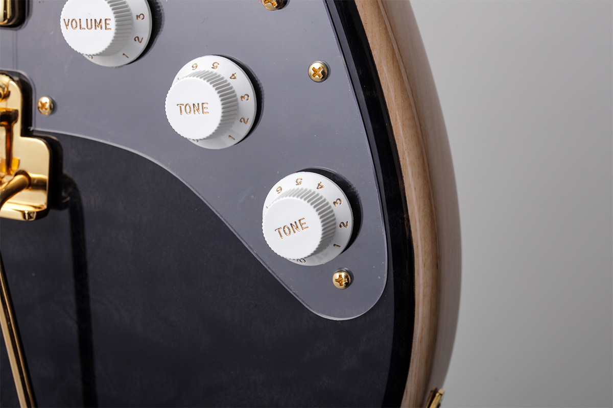 本器のボディ材は2ピース・アッシュに、トップ材として3Aグレードのキルテッド・サペリをラミネート。ネックには1ピース・ローステッド・バーズアイ・メイプルがセットされている。使用された材は、米国フェンダーカスタムショップとの綿密な連携のもと、1本1本の表情を丁寧に確認しながら特別選定されたものだ。妥協を許さないプロセスを経て選び抜かれた材が、本器の存在感を決定づけている。