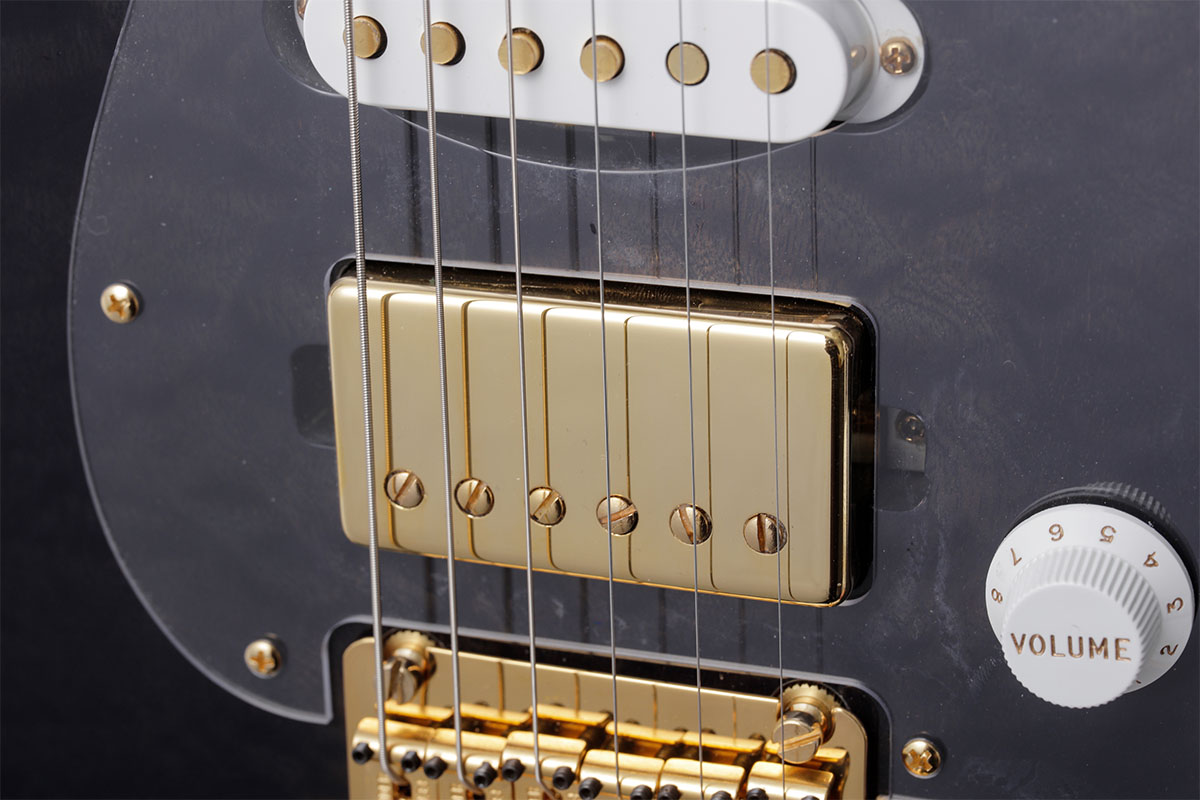 ハードウェアはゴールドで統一。フロントおよびセンターに搭載される、マスター・ピックアップ・ワインダー、ホセフィーナ・カンポスの手によってハンド・ワウンドされた“Fat 50’s”シングルコイルは、ポールピースにいたるまでゴールド仕様とする徹底ぶりだ。リアにはSeymour DuncanのJB(SH-4)を搭載し、HSSレイアウトによる高い汎用性を確保。世界各国からプレイヤーが訪れるFender Flagship Tokyoならではのニーズを反映した構成といえる。