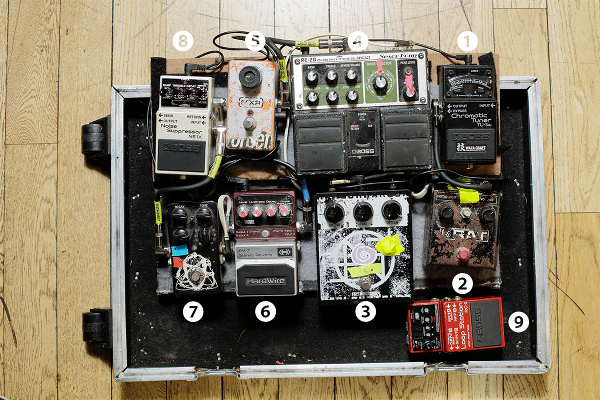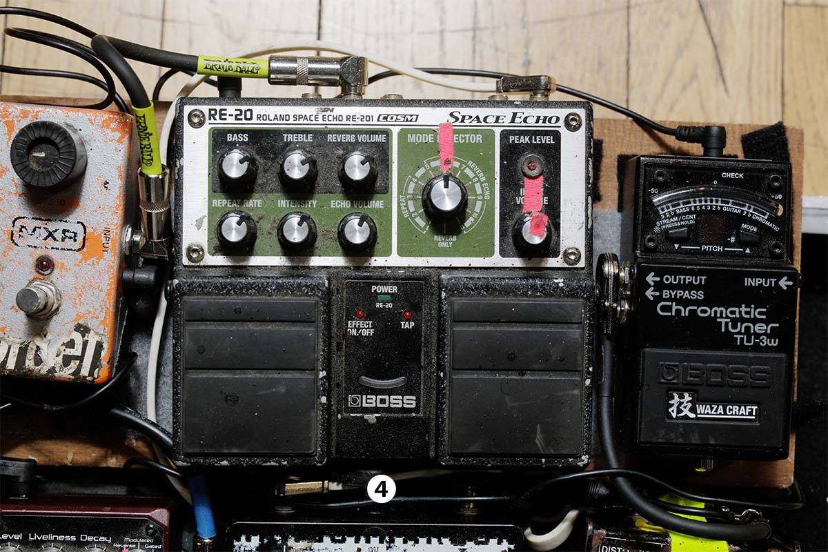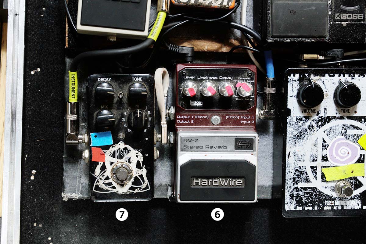 ④RE-20は「The Carpenter’s Son」のアウトロで、タップ・テンポを使いながら使用。⑥RV-7や⑦Trinityと組み合わせ、不安定なテープ・エコーとして使っている。