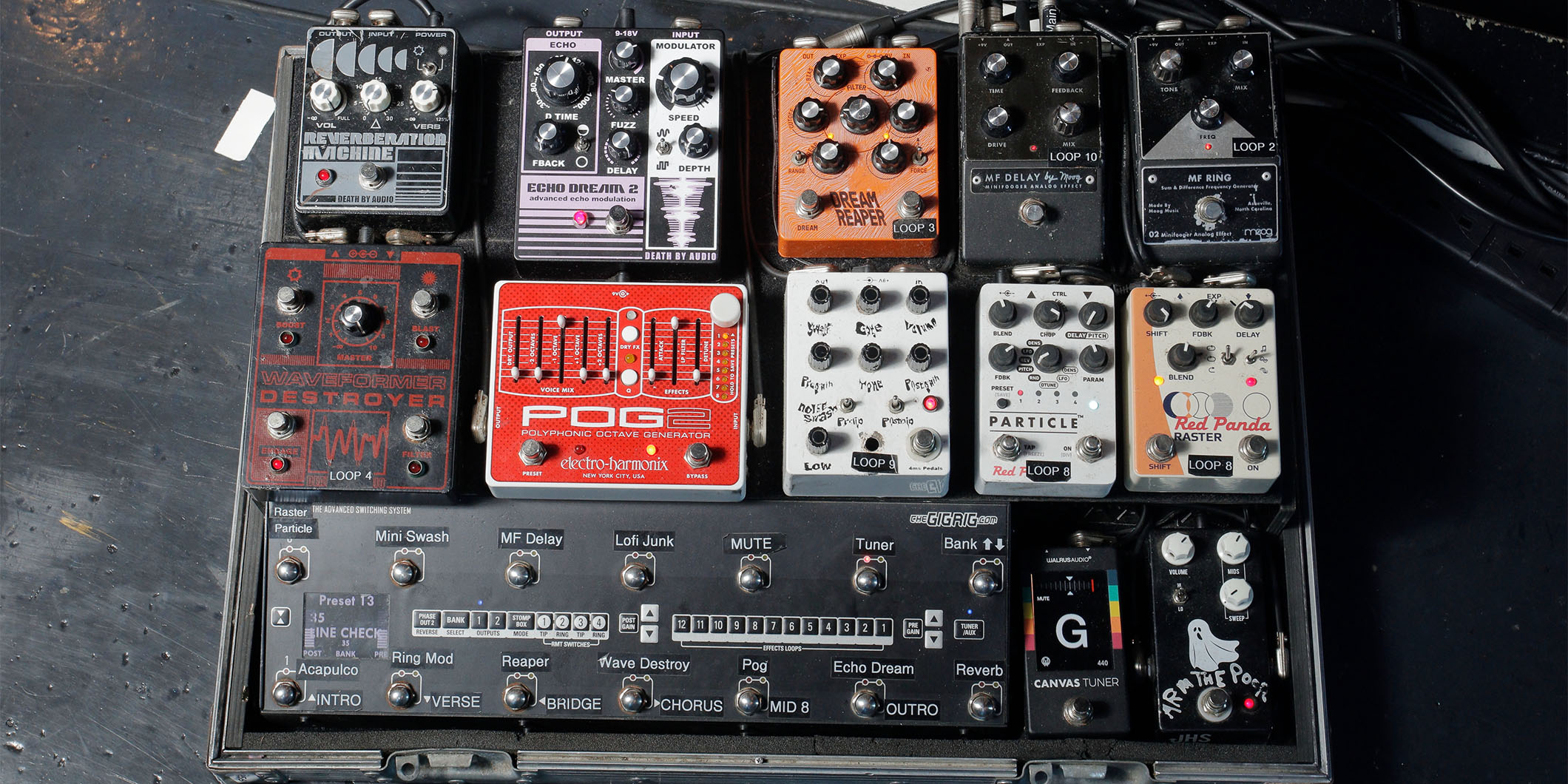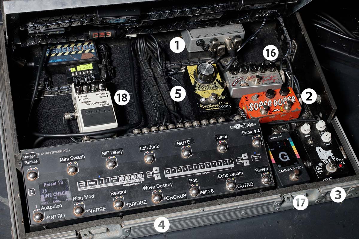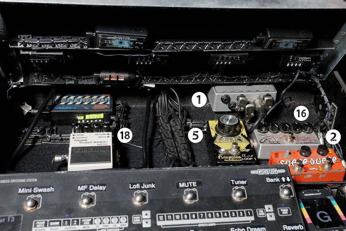 ⑬Particle 2は「Progress」のレコーディングで使用。マークは“刺激的でクリエイティブなペダルだ”とコメント。⑭Mini Swash Fullはおもに『Ultra Mono』(2020年)の楽曲で使用するが、あまりにもカオスなサウンドのため、過去にアンプを何台も飛ばしてしまったことがあるという。『Ultra Mono』の楽曲はあまりライブで演奏しないため、現在は実験用、もしくは楽曲の最後に踏むこともあるそうだ。