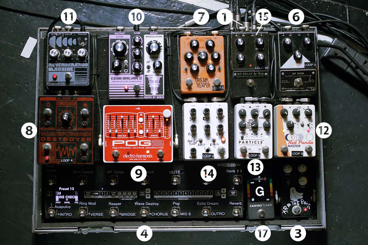 ⑩ECHO DREAM 2は「Car Crush」を始め多くの楽曲で使用しているディレイで、マークにとって欠かせないペダルの1つである。⑥MF Ringと⑮MF Delayは「Mr. Motivator」のイントロで使用。