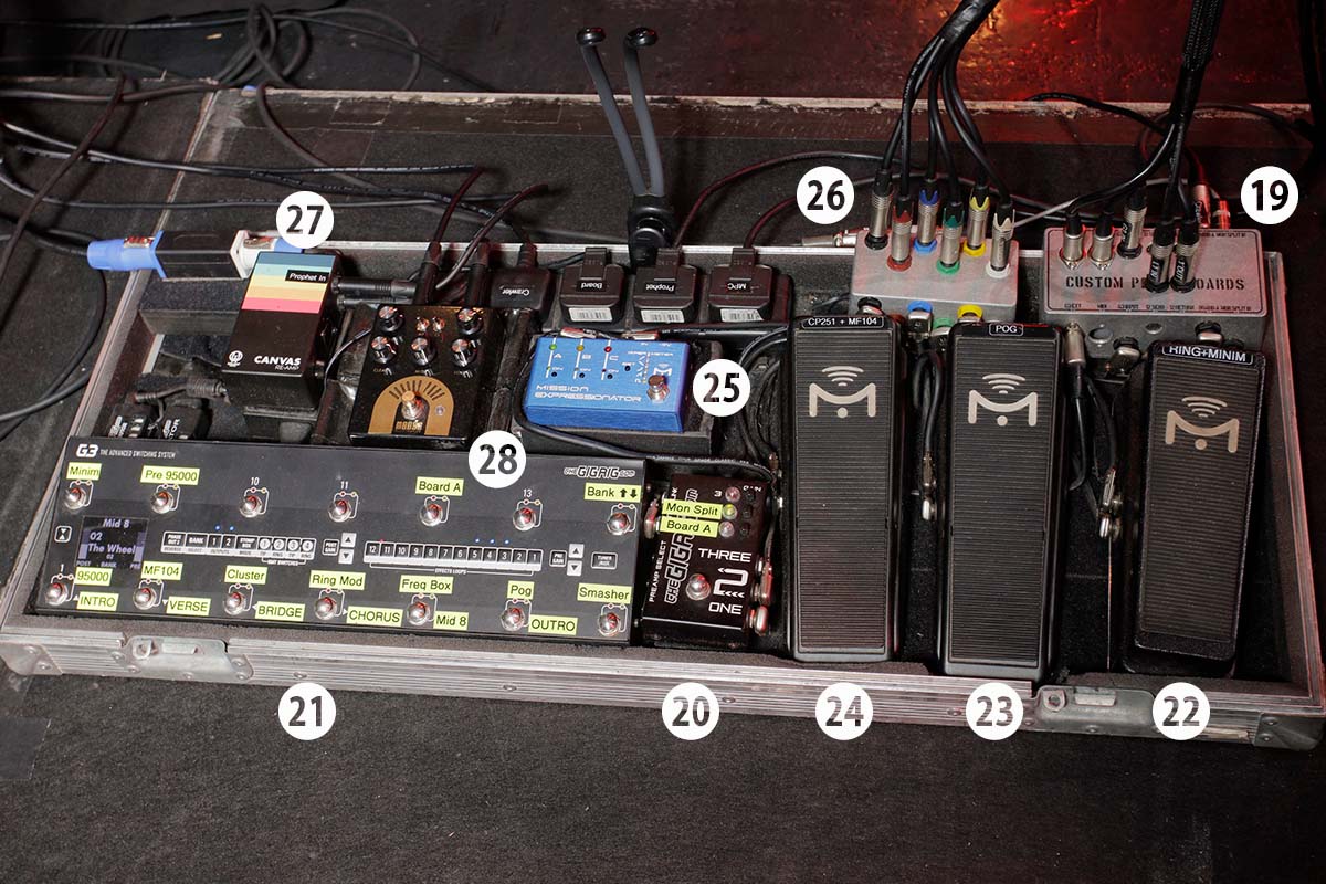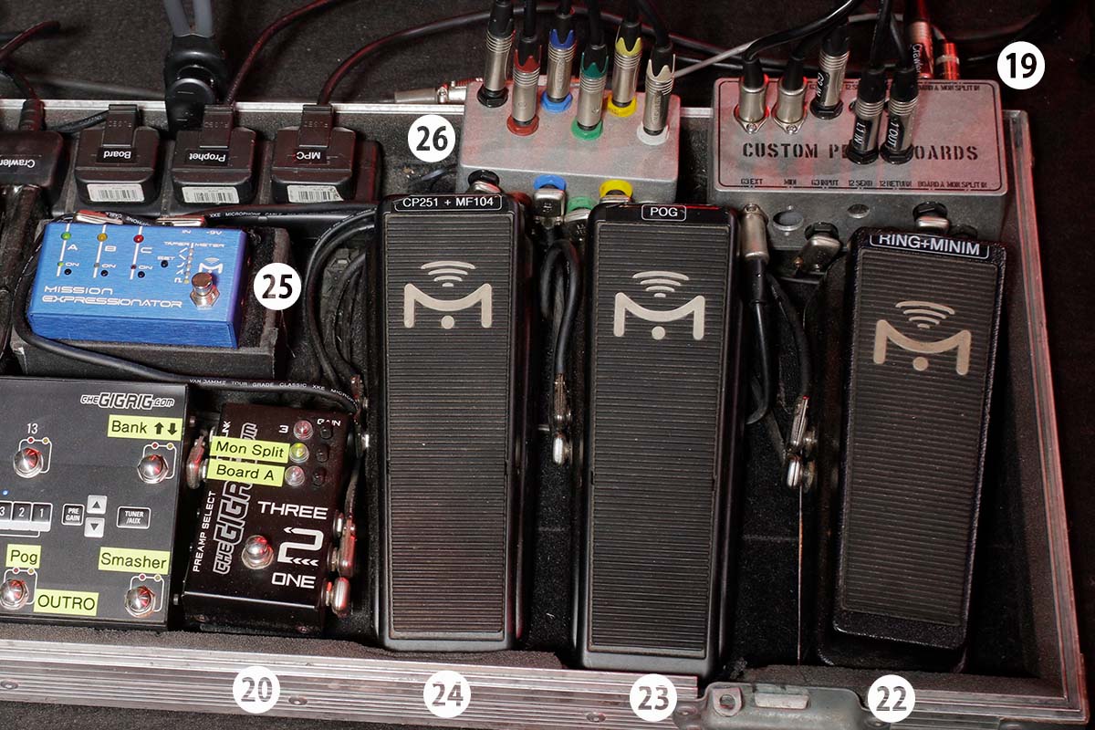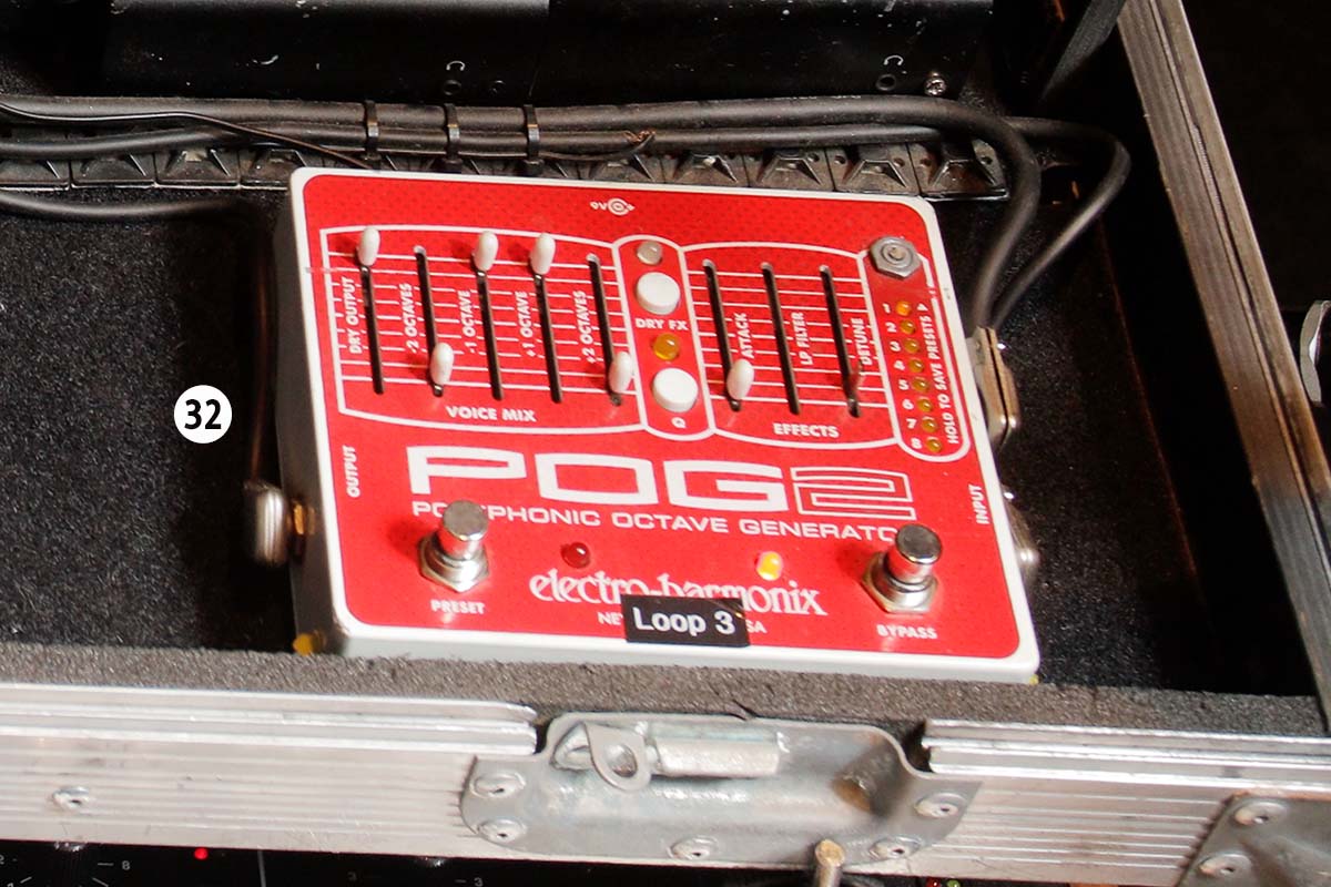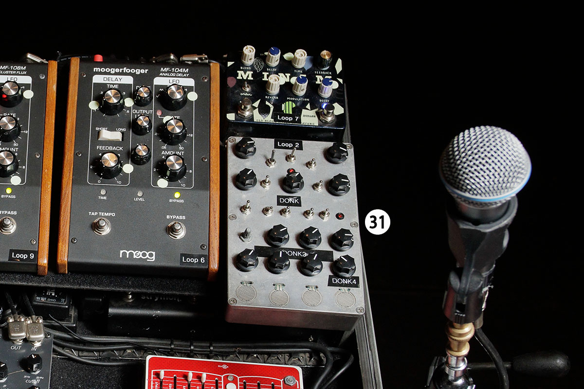 ㉜POG2はモディファイされており、エクスプレッション・ペダル接続することでエフェクトのフィルターを調節できるとのこと。本機を使用する場合はメイン・ボード内の⑨POG2も同時にオンにすることもあるため、とてつもないサウンドになるそうだ。たまに⑳Three 2 Oneで入力を切り替え、ボーカルやドラムのサウンドに㉜POG2のエフェクトをかけることも。