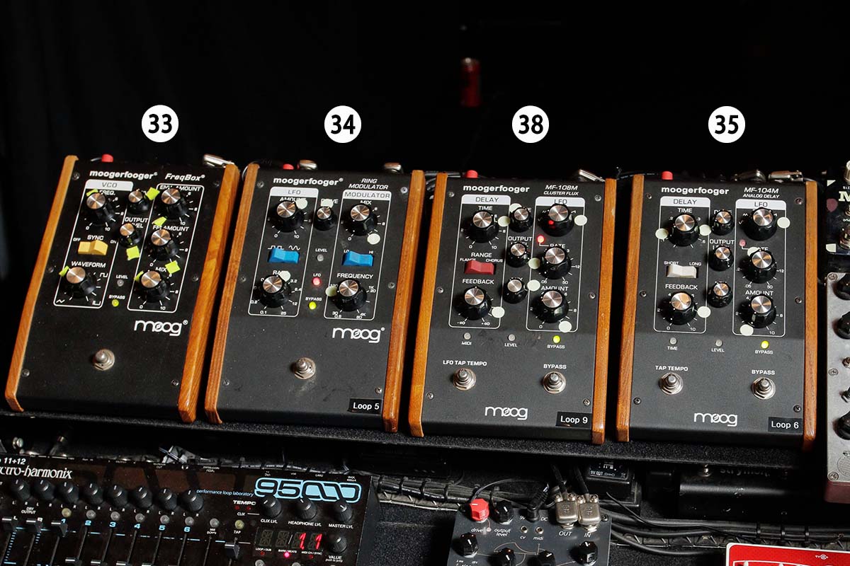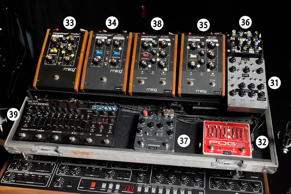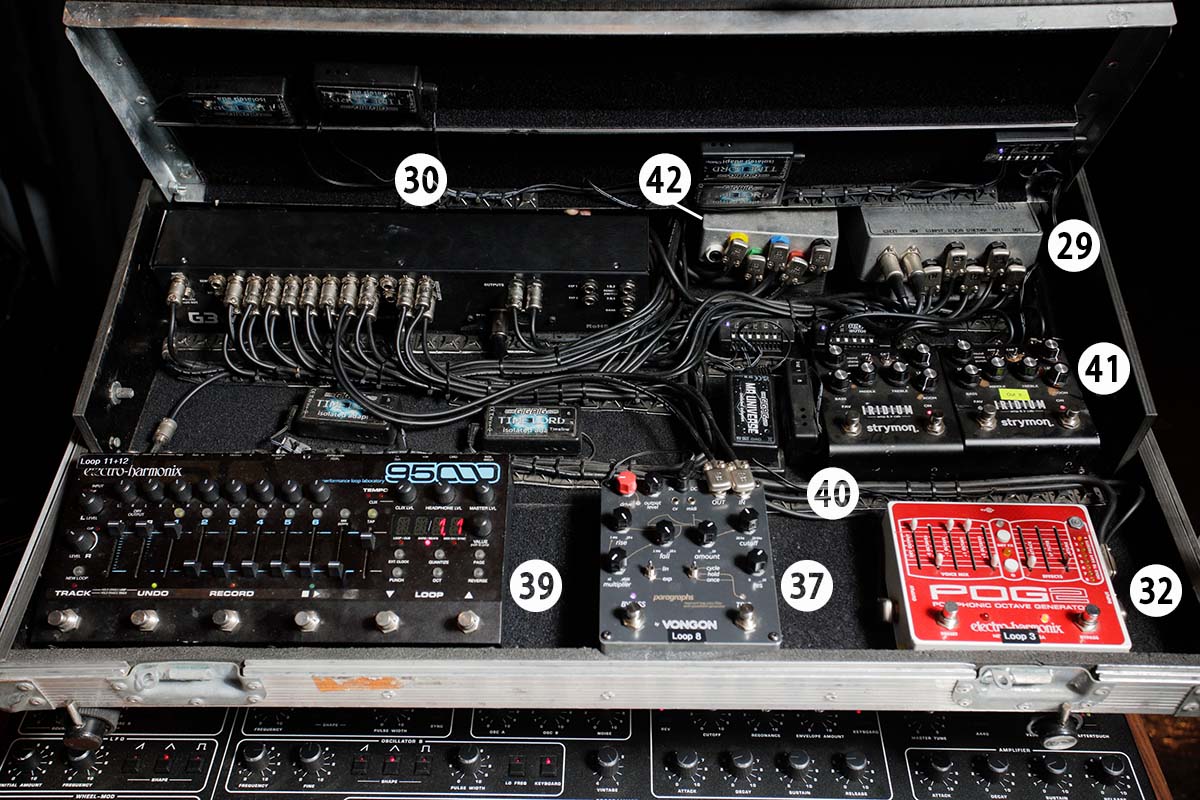 僕の足下に置いてあるメイン・ボードからのシグナルの1つは、“クローラー・マシン”と呼んでいるProphet-5の上の大きなボードに接続されている。Cluster Flux(㊳)はフランジャー/コーラスみたいなもので、僕はコーラスとして使っているよ。これと同時にAnalog Delay(㉟)の短いディレイも加えているんだ。