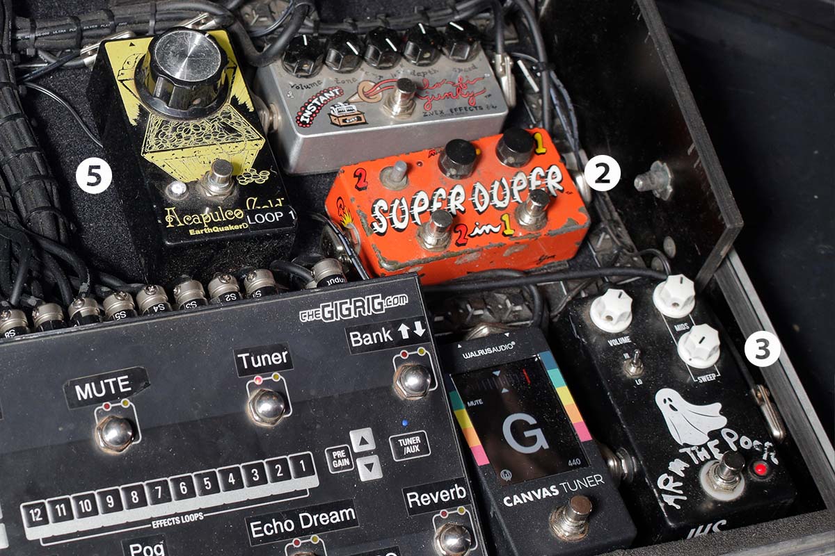 それとペダルと言っていいのかわからないけど、The GigRigのスイッチャー(④㉑㉚)おかげで、たくさんのペダルを自由に切り替えられている。シグナルのスプリットも操作できるから、例えば曲のサビでサウンドを切り換えたい時に重宝しているよ。低いオクターブと高いオクターブを1つのアンプに送ったり、どちらか一方をクローラー・マシンに送ったりすることもできるんだ。