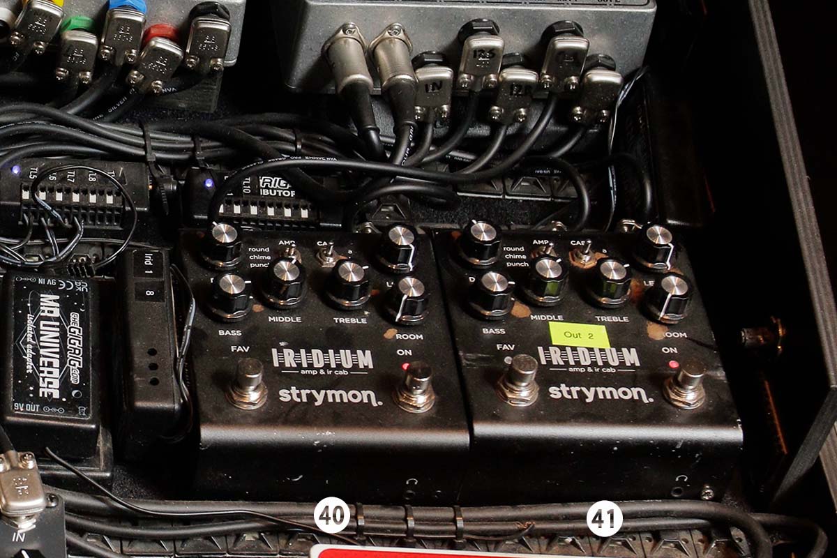 ㉚G3 Extension Kitの2つのアウトからは、それぞれ㊵㊶IRIDIUMを経由し、㉙ジャンクション・ボックスと、Rupert Neve DesignsのRNDI-S(ステレオDI)を通ってPAに信号が送られる。片方のIRIDIUMにはOrangeの、もう片方のIRIDIUMにはHiwattのキャビネット・シミュレーターをアサインしているとのこと。マーク曰く“IRIDIUMはギター用のDIとして使っている”。