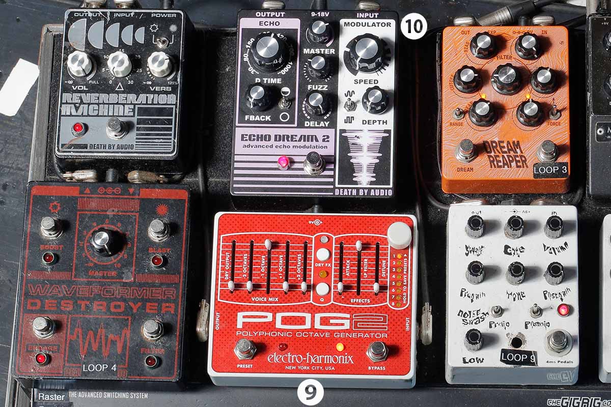 POG2(⑨)とECHO DREAM 2(⑩)は絶対に必要だね。ほかのペダルは数曲だけとか、たまに使うっていう程度なんだ。ECHO DREAM 2はライブ中の90%で使っているくらい重要だね。曲のビッグなエンディングとか、特定のパートとか、プロダクションの観点から必要な場合にはリバーブを足すこともあるよ。僕はベースっぽいことや、ハイ・ピッチでのプレイもたくさんやっているから、POG2もはずせないんだ。