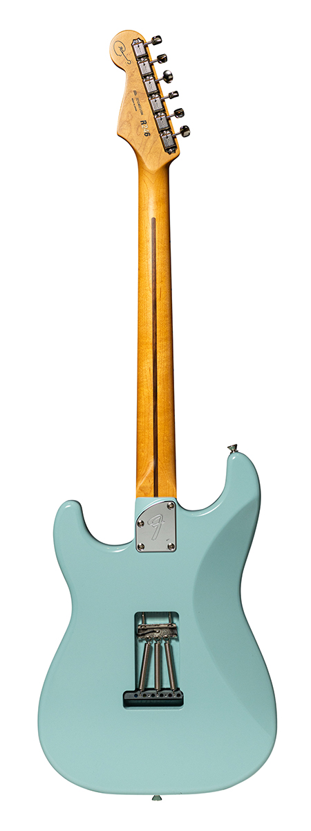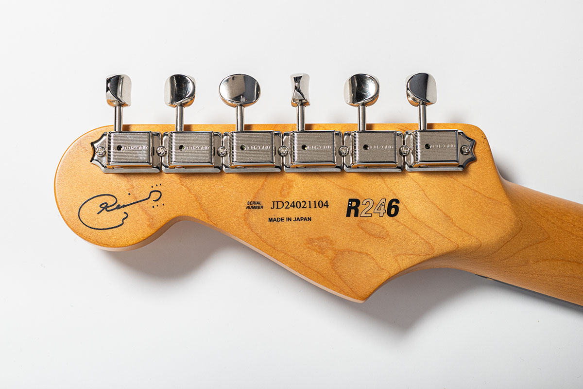 ボディの色とヘッド裏の“R246”ロゴです。ロゴは私がデザインしていて、70年代ストラトキャスターのデカールをオマージュしたフォントです。色は当時と同じようにゴールドとブラックを使っていて、Rと4には24フレットにある2つのドット・ポジション・マークを入れているんです。お気に入りのポイントですね。